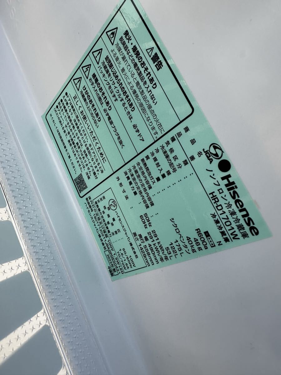 Hisense ハイセンス 冷蔵庫 2ドア HR-D1701W 2023年製 175L ホワイト 家財便 中古