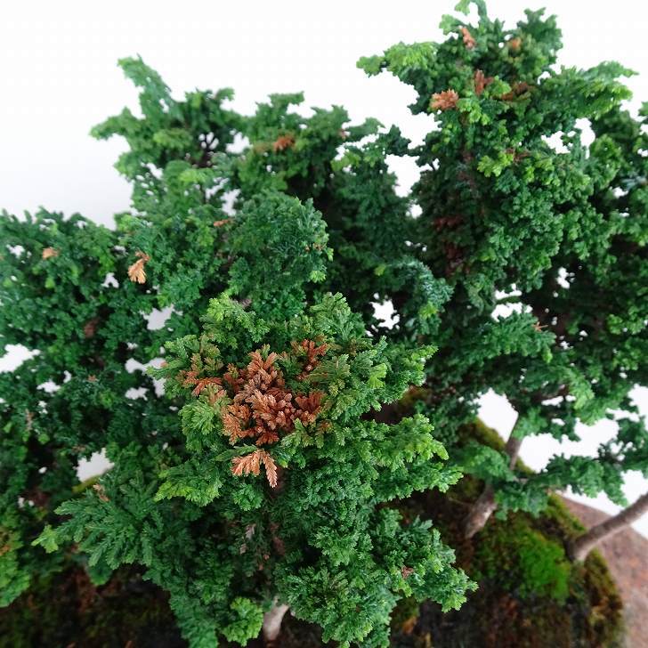 | ■植物ですので撮影時期や季節によって剪定などの手入れにより写真から変化がございます。撮影日をご確認のうえ、ご注文ください。 【石化桧盆栽】 一般的なヒノキより葉が細かく縮れている特徴があります。 |