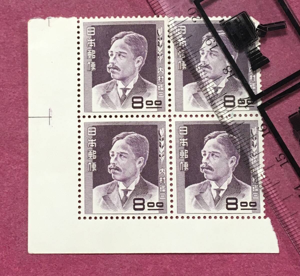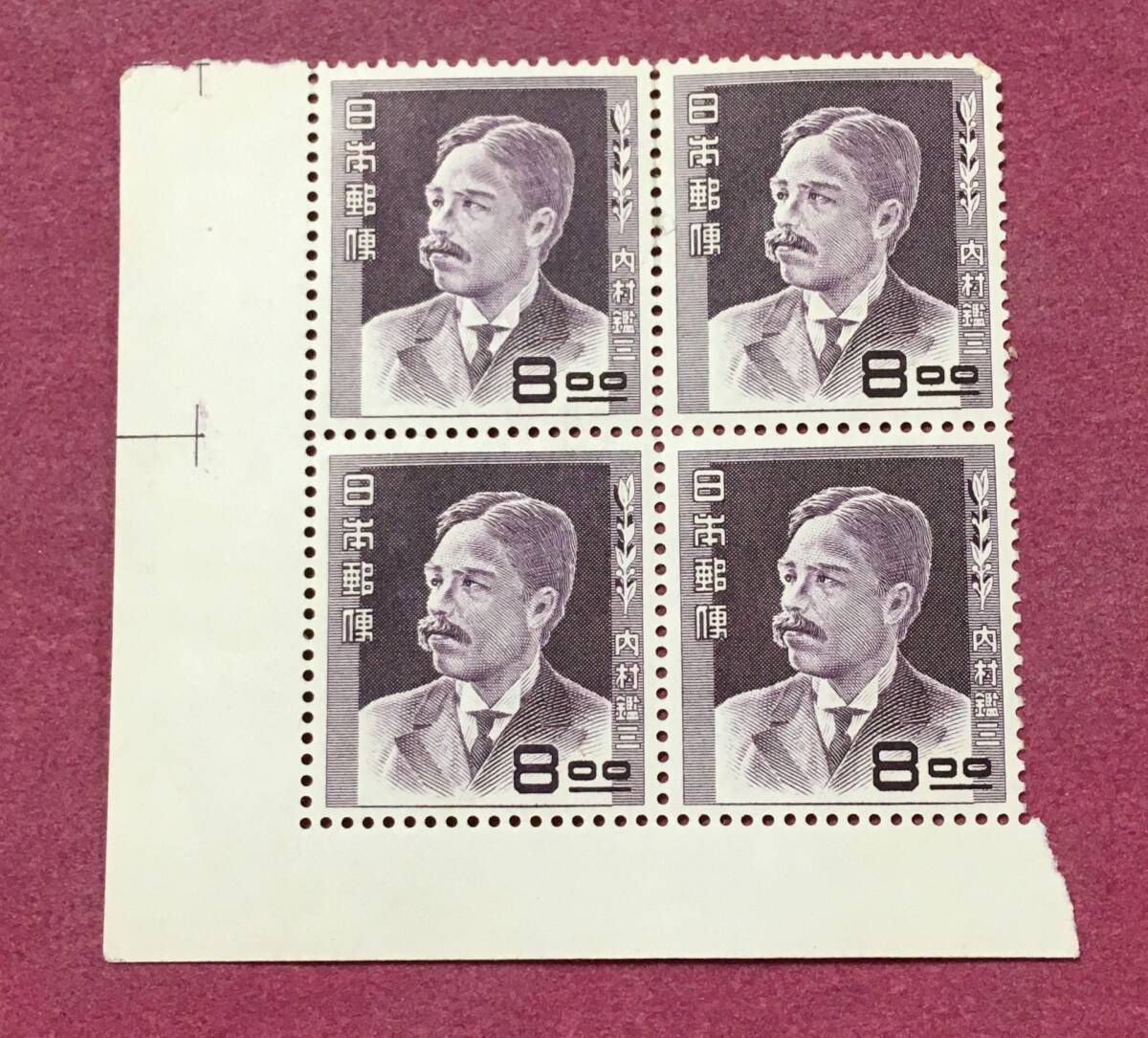 ほぼ裏糊なし 文化人シリーズ 内村鑑三 8円 田型 4連 未使用品