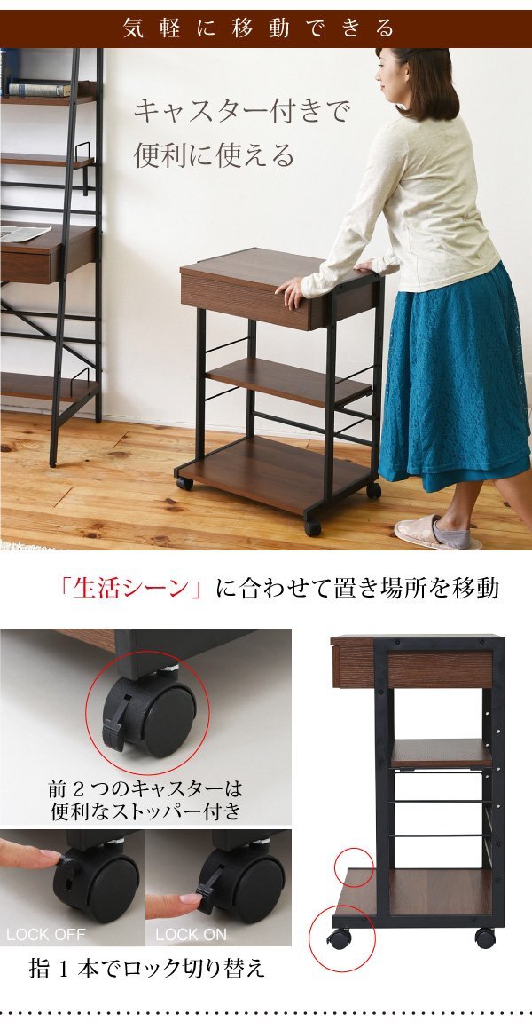 ※現在ご覧の商品ページはブラウンのご購入ページとなります。 ヤフオクの仕様上単一ページに複数バリエーションを掲載することができませんので、他バリエーションが希望の場合は別ページでご購入お願い致します。 ※テーブルや撮影時の小物は付属しません。 デスクサイドのプリンター置きに最適なキャスター付きサイドワゴン。 引き出し収納はプリンター周りの小物類の整理整頓に大活躍。 A4ファイルも置けるラックスペースも。 配達業者を指定いただくことはできません。 沖縄・離島への配送は別途配送料が必要です。 ※別途送料が発生する場合は後ほどご連絡させていただきます。 タイミングによっては在庫切れの場合があります。