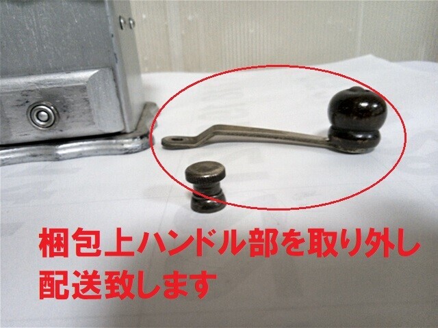 レトロな手挽きのコーヒーミルです。 使用感ございます。 経年の擦れ、小キズ、色落ち等々ございます。 引き出しのネジ部にゆるみあります。 サイズ 横長さ9.1cm(ハンドル部除く長さ) 高さ19cm ハンドル部長さセンターから9.5cm ーーーーーーーーーーーーーーーーーーーーーーーーーーーーーーーーーーー 追跡保証なし定型外920円 ゆうパック60サイズ ※ ゆうパックの場合梱包の関係でハンドル部を取り外して 配送します。ご理解ください。 | |||
