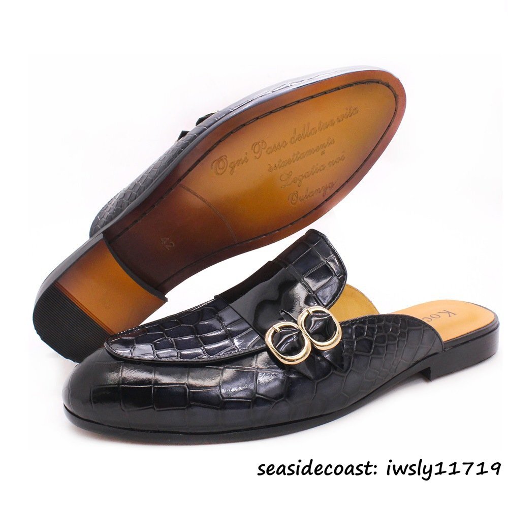 超美品◆定価9万 モンクストラップ 鰐柄 スリッパ ビジネスシューズ 本革 レザーシューズ 職人手作り 紳士靴 革靴 牛革 ネイビー 26.5cm