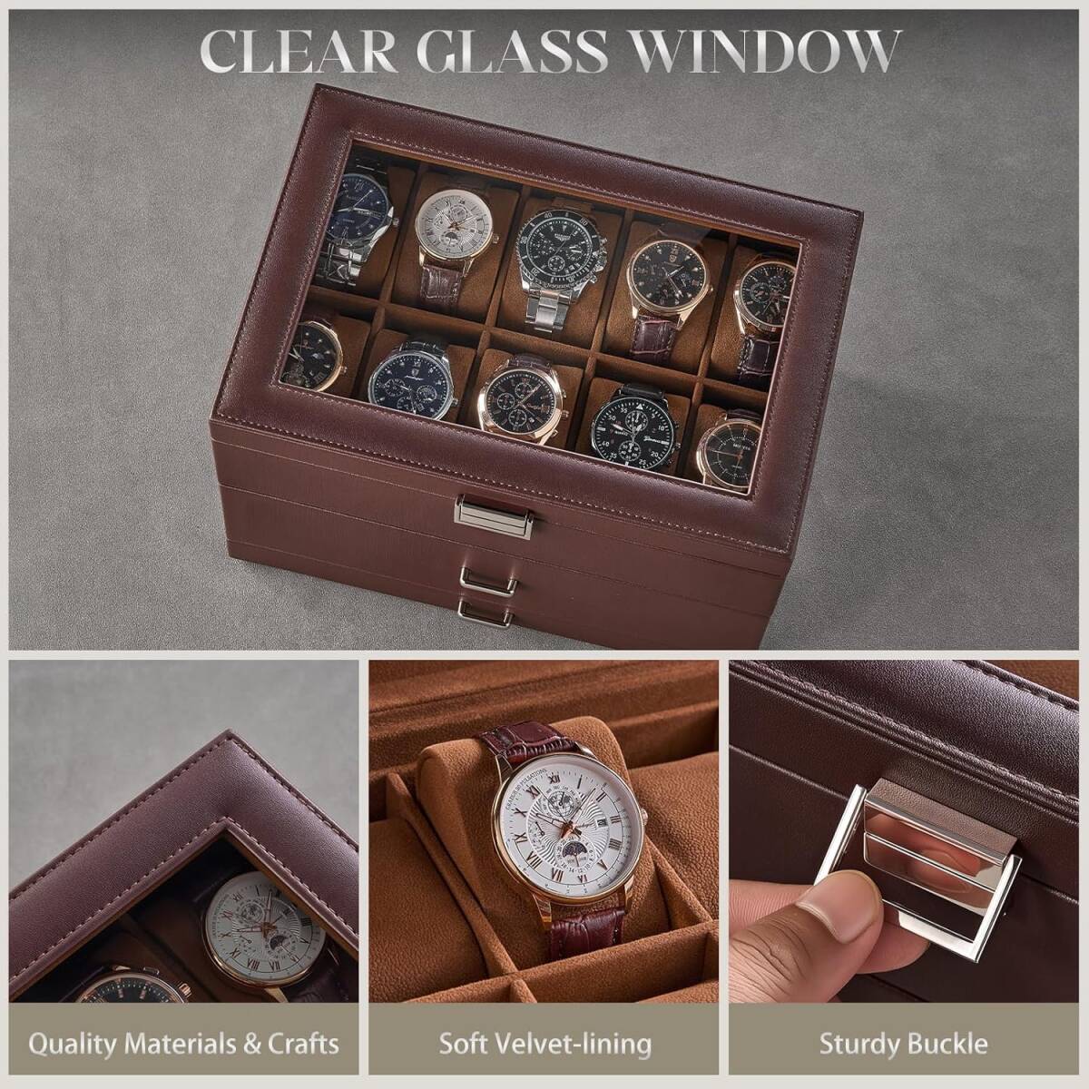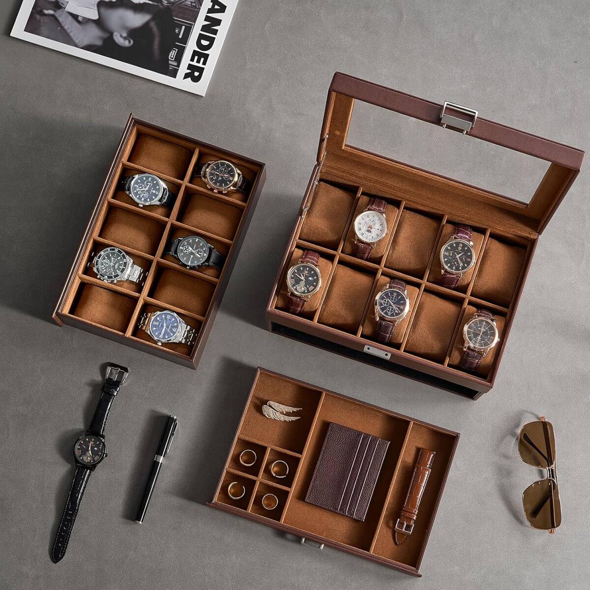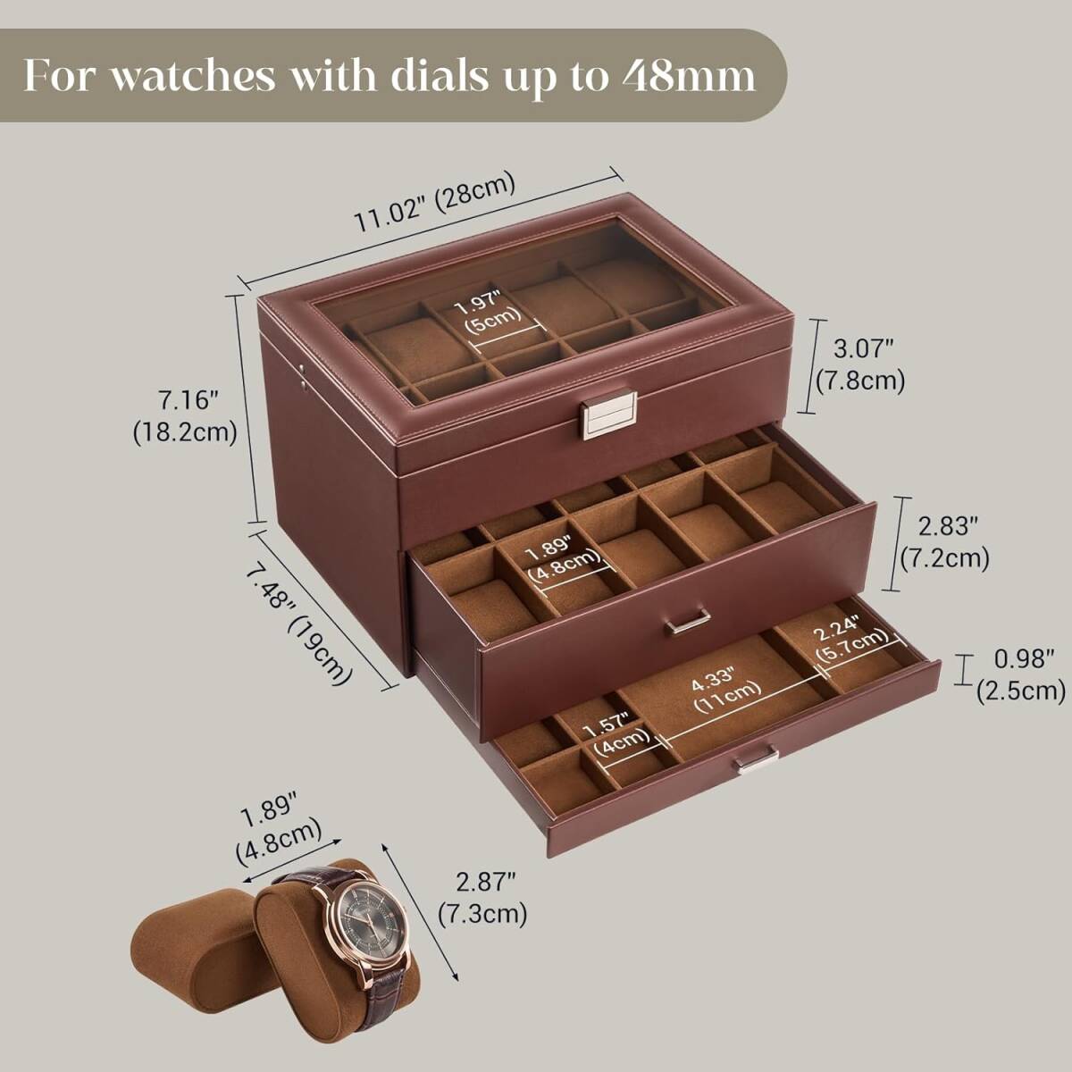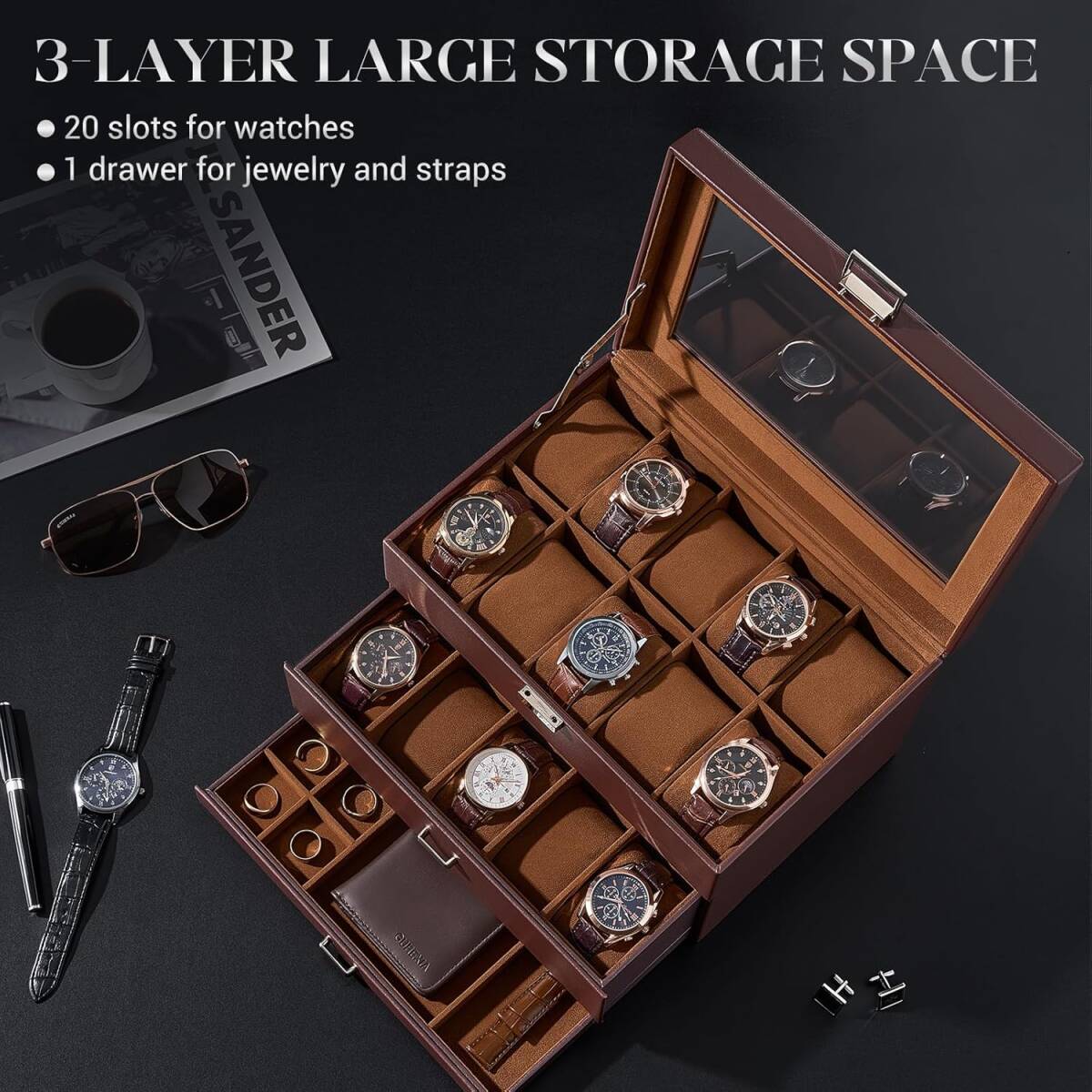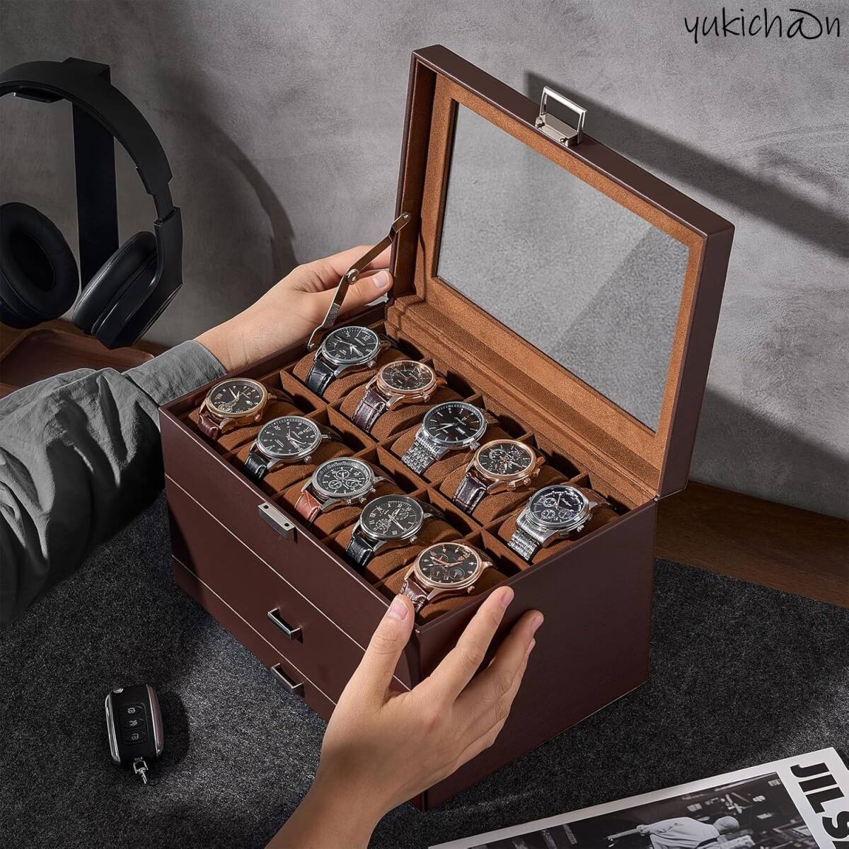 ウォッチボックス 3段式腕時計ケース ブラウン 20本 大容量 男性用 引き出し ジュエリーオーガナイザー ガラス天板 ディスプレイ収納ケース