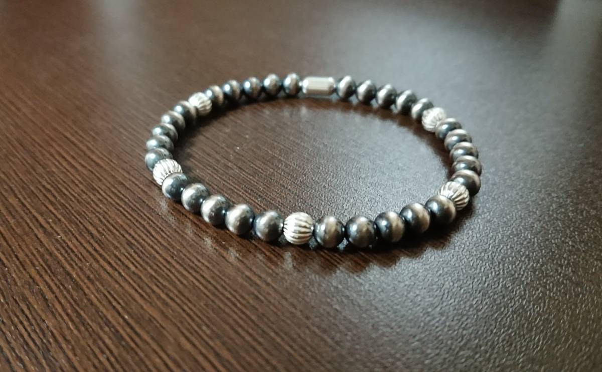 この技術は伝統的なアメリカ先住民の銀細工から生まれたもので、その出来上がりが真珠のように美しいことからナバホパールと呼ばれています。見た目の重厚感より実際は軽く、落ち着いたシルバーの風合いが魅力的です。