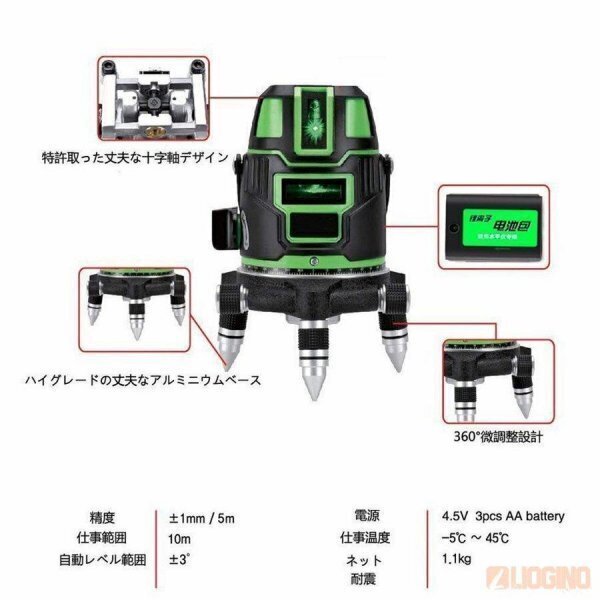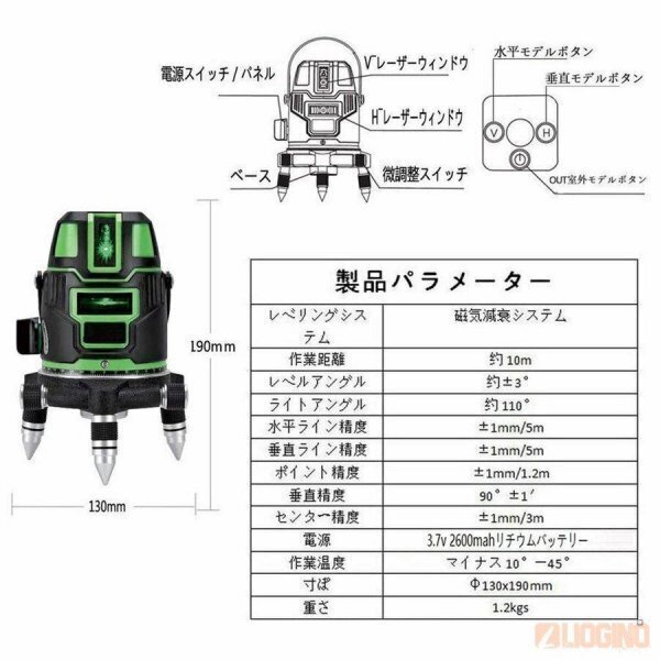 • 【製品仕様】 照射パターン:5線6点、垂直4本、水平110°、地墨点 レベリングシステム: 磁気減衰システム 作業距離 :約10m レベルアングル:約±3° ライトアングル:約110° 水平ライン精度:±1mm/5m 垂直ライン精度:±1mm/5m ポイント精度:±1mm/1.2m 垂直精度:90°±1′ センター精度:±1mm/3m 作業温度:マイナス10°〜45° 寸法: φ130x190mm 重さ:1.2kg