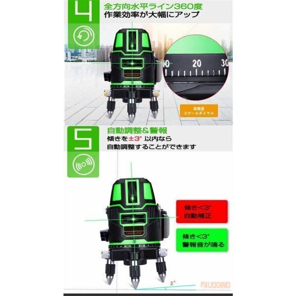 • 【自動調整機能】 本体の傾きが3°以内の場合、自動で補正し水平を維持します。本体の傾きが3°以上であった場合、アラームが鳴り、レーザーラインが点滅します。 誤差を減らし、仕事効率を向上させることができます。【360度回転、高さ調整】 本体を360度、回線できるのでレーザーの位置を任意に調整することができます。 脚を回すと、高さの微調整が可能です。