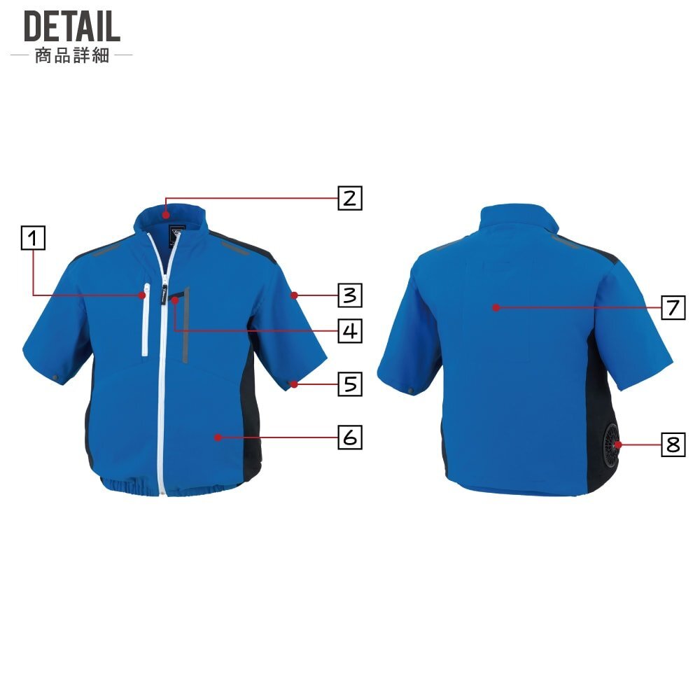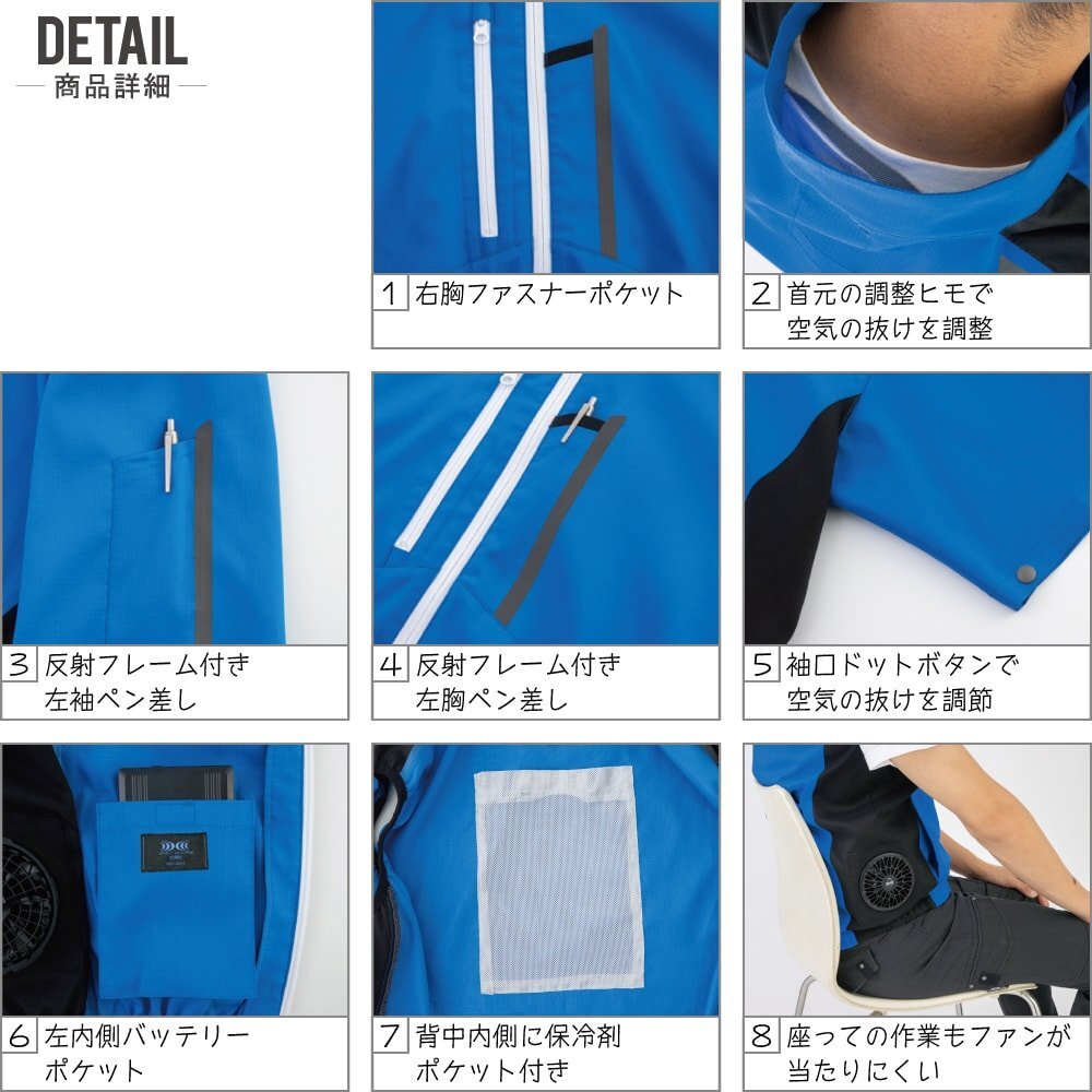 特長:調整紐(首元)/左内側パッテリー専用ポケット/右胸ポケット/左胸ペン差し/左袖ペン差し/袖口ドットボタン