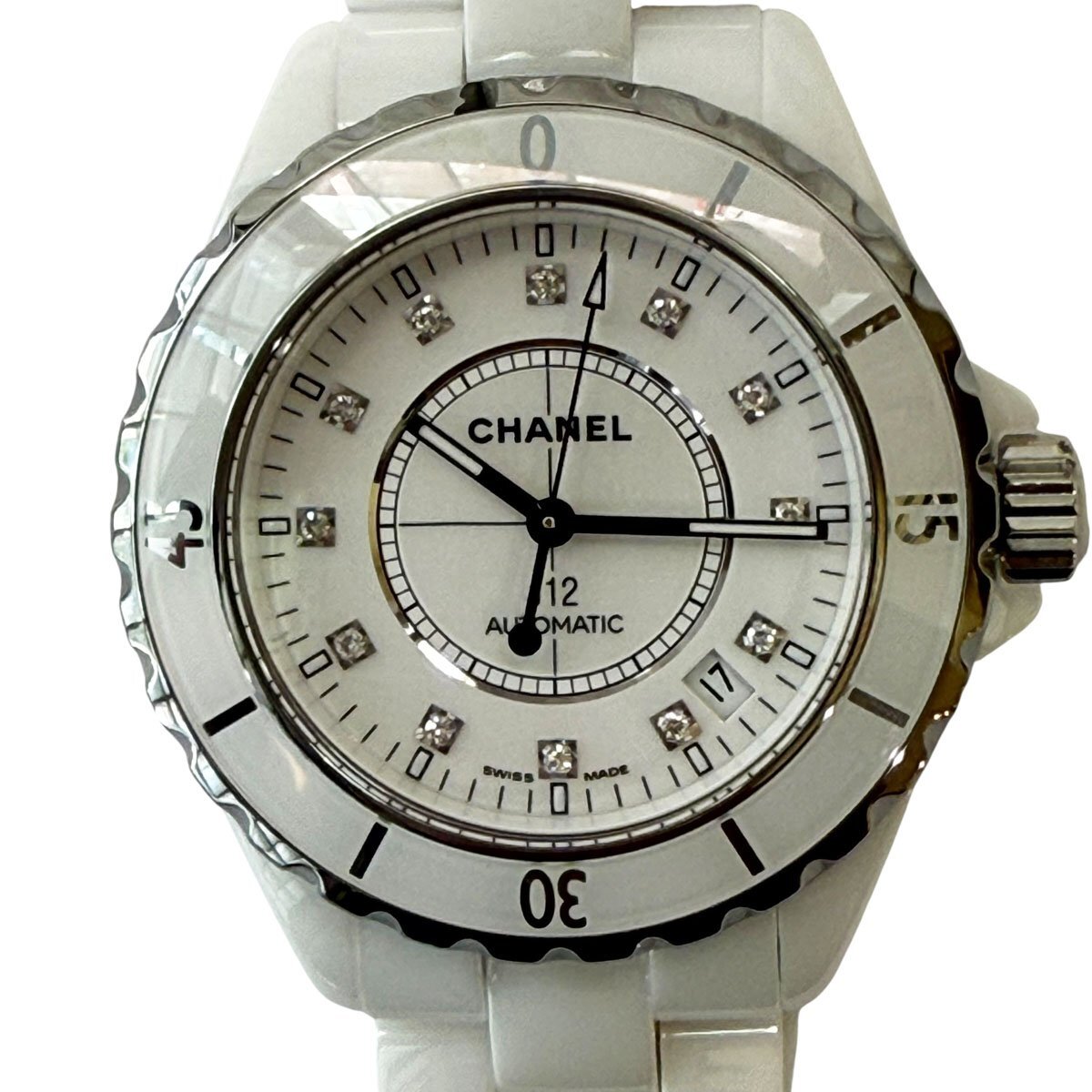 OH済み◆シャネル◆J12 12Pダイヤモンド H1629 白 セラミック 38m 自動巻き ベゼル欠け有り メンズ腕時計 質