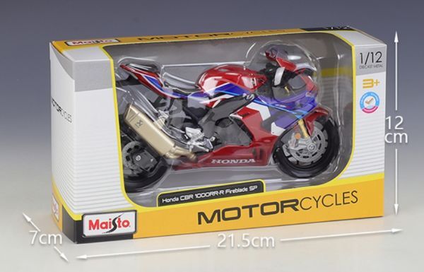 マイスト Maisto 1/12 完成品 HONDA CBR1000RR-R Firablade-SP ライセンス公認 Maisto社製 【スケール】1/12 【サイズ】全長約170mm 【素材】 本体:ダイキャストABS タイヤ:ゴム ガソリンタンク:亜鉛合金 商品重量: 220g タイヤ回転、ステアリング可動、一部サスペンション可動。 1/12可動フィギュア、キャラクタープラモデルとの相性抜群です。 | |
