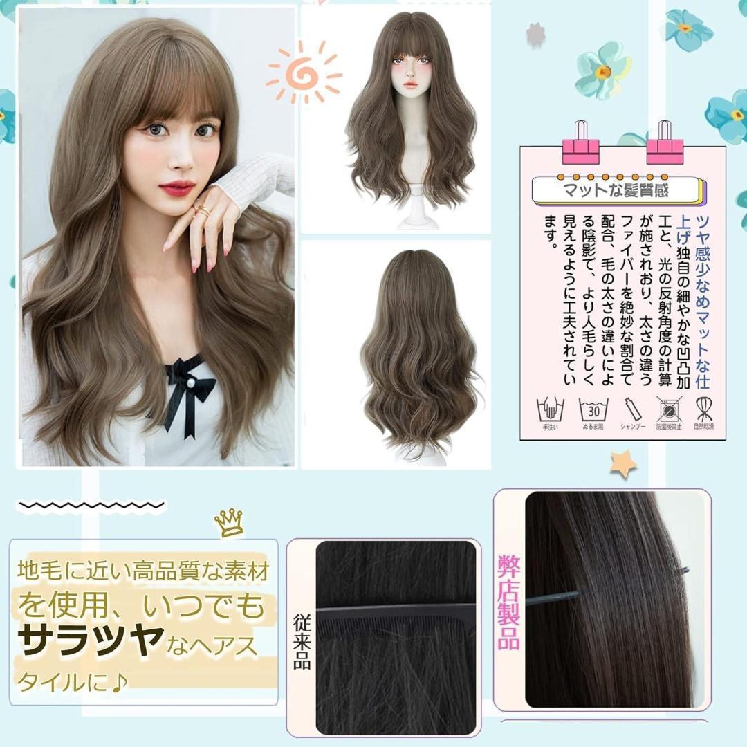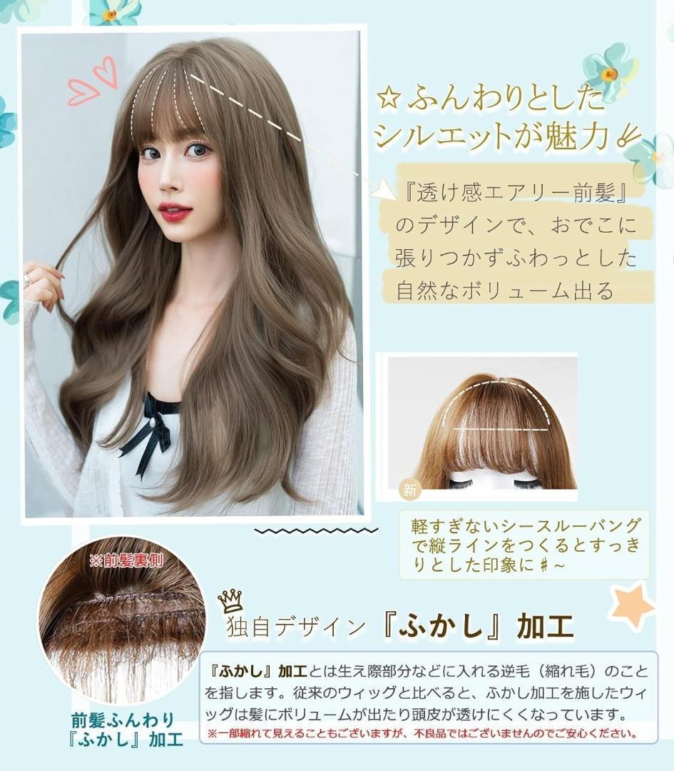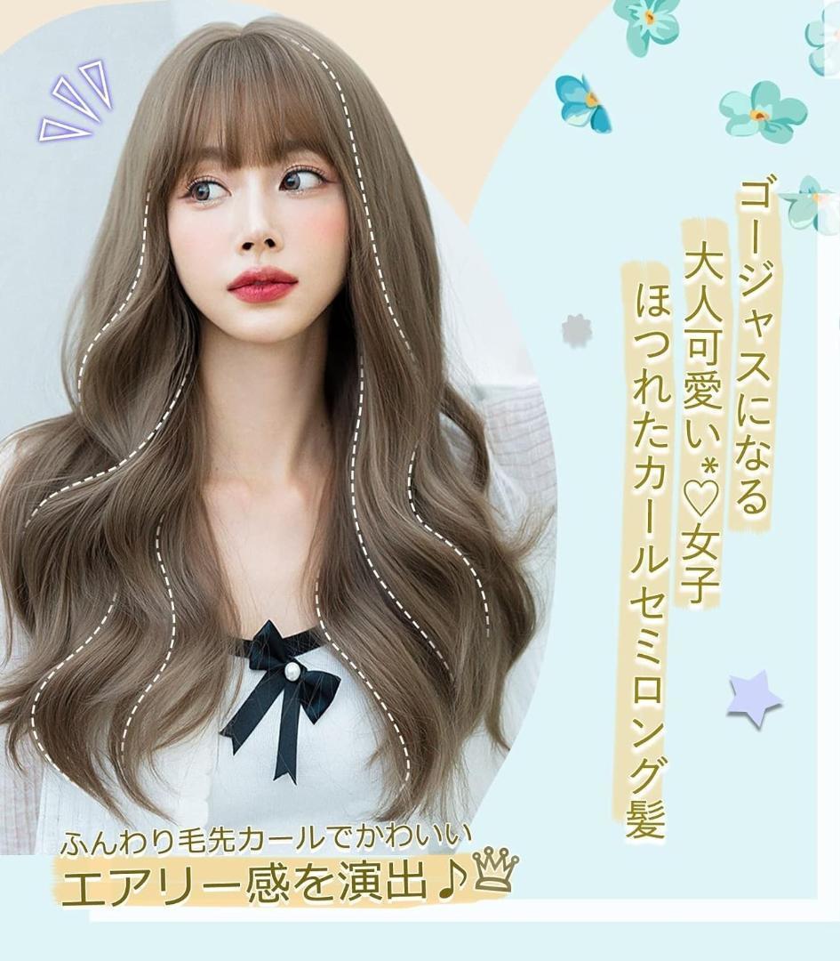 『ふんわり柔らかくヨシンモリ巻きロングウィッグ』:セミロングレイヤーカットで自然なエアリーな質感を出します。長さ約55cm、ボリューム感があり、巻き風パーマでON,OFFどちらもいけて、カジュアルな中にもキチッと感のある抜け感ヘアに。