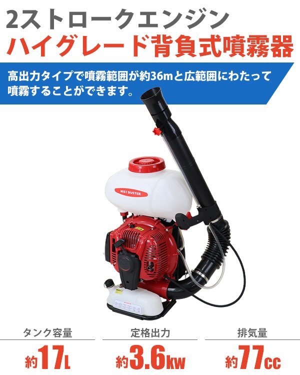 ■17L大容量タンクのエンジン式のハイグレード背負式噴霧器です。 ■エンジン式なので電源がない場所でもご使用できます。 ■タンクの投入口には異物の混入を防ぐストレーナーが付いています。 ■本体重量は約12.9kgと軽量設計なので扱いやすいです。 ■手元のコントロールハンドルで「回転スピードの調節」「水流開閉」「エンジン停止」の操作ができます。 ■ノズルは用途に合わせて脱着が可能です。 ■風量約27m3/min、風速約105m/sとハイパワーなので遠い場所(約18m)や高い場所(約16m)も届きます。 ■水量調節ダイヤルで1~6段階の水量調節ができます。 ■噴出量は1分間に約0.1~3.5L噴出させることができます。 ■背中があたる部分には「背面クッション」、肩掛けベルトは「幅広肉厚クッション」になっているので作業中の背中、肩への負担を軽減します。 ■背面クッションとエンジンの間には衝撃吸収のスプリングが設置されています。 ■除草剤や液体肥料、液体消毒の散布など様々な場面で大活躍します。 ※有機溶剤は、タンクやポンプの破損の原因となりますので絶対に投入しないでください。 ※タンク投入前に必ず水流開閉レバーを「閉」の位置にしてから投入してください。 ※「開」の状態ですとタンク内の液体が噴出口より漏れ出るのでご注意ください。 ■本体重量:約12.9kg 「エンジン」 ■エンジン出力:3.6w/6500rpm ■回転数(作業時):6500rpm/分 ■回転数(アイドリング時):3500rpm/分 ■排気量:約77cc ■始動方法:リコイルスターター ■使用燃料:混合油(レギュラーガソリン、2サイクルエンジンオイル) ※混合油は25(レギュラーガソリン):1(2サイクルエンジンオイル)で作成してください。 ■推奨エンジンオイル:JASO FBグレードの2サイクルエンジンオイル ■燃料タンク容量:約2.5L ■燃料消費量:約0.8~1.2L/h ■燃料満タン時連続使用時間:約2~3時間 ※燃料の補充は、必ずエンジンを停止させてから行ってください。 ■騒音値:約90dB ■材質:ポリエチレン[PE](タンク、燃料タンク、ストレートホース、計量容器)、ポリプロピレン[PP](ノズル、カーブホース)、EVA樹脂(蛇腹ホース)、ポリ塩化ビニル[PVC](チューブ)、発泡材(背中クッション)、織物(肩掛けベルト) ■セット内容:本体、ストレートホース、チューブ、ノズル、カーブホース、蛇腹ホース、混合燃料計量容器、メンテナンス工具、日本語説明書 ●ご使用前に、必ず取扱い説明書をご確認の上、十分理解して本機をご使用下さい。 ★1階車上でのお渡しとなります。恐れ入りますが荷降ろし・搬入は、お客様にてお願い致します。 ●新品商品ではありますが、輸入商品の為、多少の擦り傷などがある場合がございますので、ご納得の上ご購入下さいませ。 ●ご購入後、お客様ご都合によるご返品、ご返金等は一切お受け致しておりません。 ●本商品を使用した際に発生したトラブル、事故につきまして、当社は一切の責任を負いません。 ご使用に関しましては、全て自己責任にてお願い致します。 |