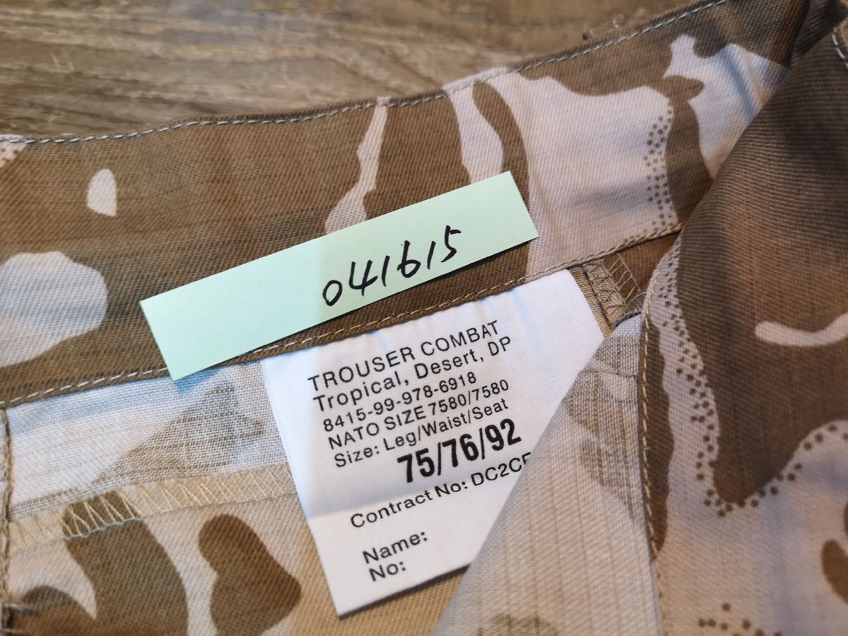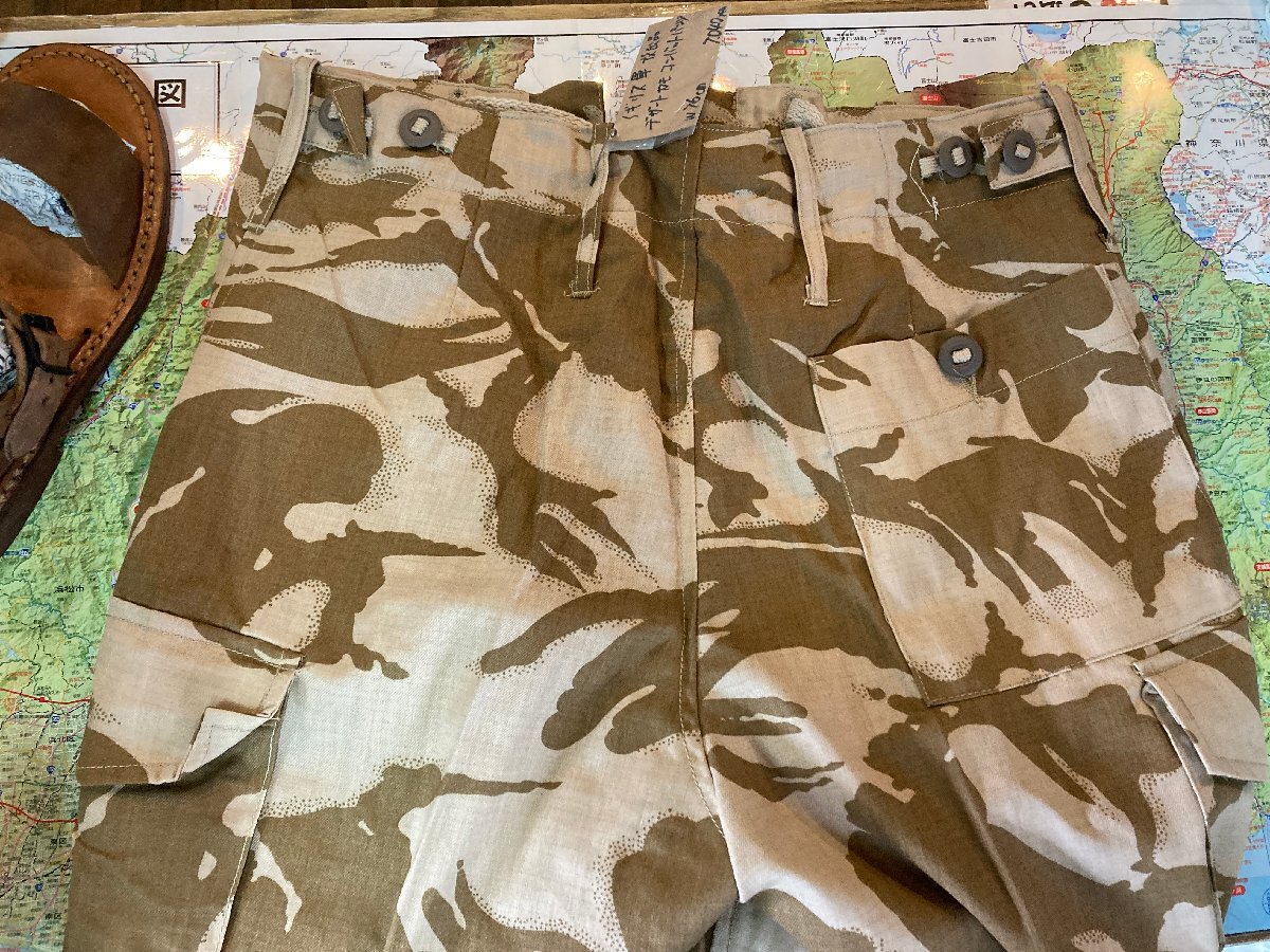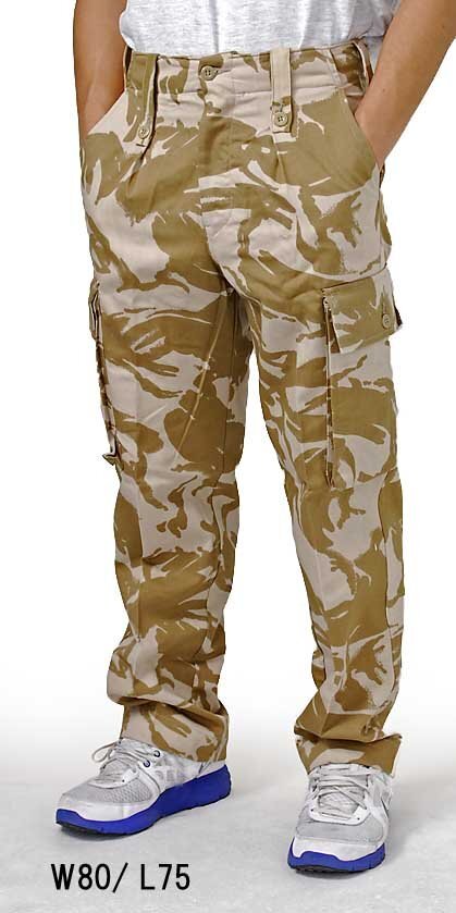イギリス軍放出の未使用本物。砂漠地方で着用するコンバットパンツ薄手の綿100生地です。 ポケットは前2つ、カーゴポケット2つ、後ろポケットは1つ、フロントフライはジッパータイプ。 ウエスト内側に絞れる様に太目の紐が内蔵されています、さらにウエスト両サイドにサイズ調整ボタンあり。淡いベージューの色合いで街で穿いても違和感ない夏の定番カラー。 イギリスのタグのサイズ表示はレングス/ウエスト/ヒップの順です。 サイズ75/76/92は股下が77センチほど、わたり34cm、裾23cm。太いウエストの紐が入っていますのでベルトなしで十分使用できます、またベルトループは9センチほどの幅があり逆に太いベルトも使用可能です。 沖縄離島を除く全国元払い500円でお送りいたします。落札価格にプラスでお願いします。 最後の写真以外は流用です。