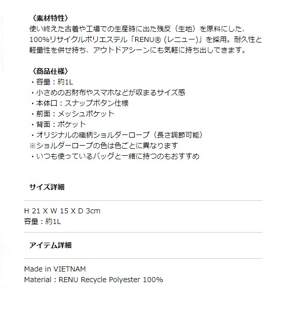 使い終えた古着や工場での生産時に出た残反(生地)を原料にした、100%リサイクルポリエステル「RENU (レニュー)」を採用。