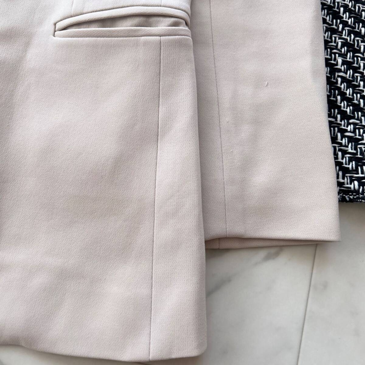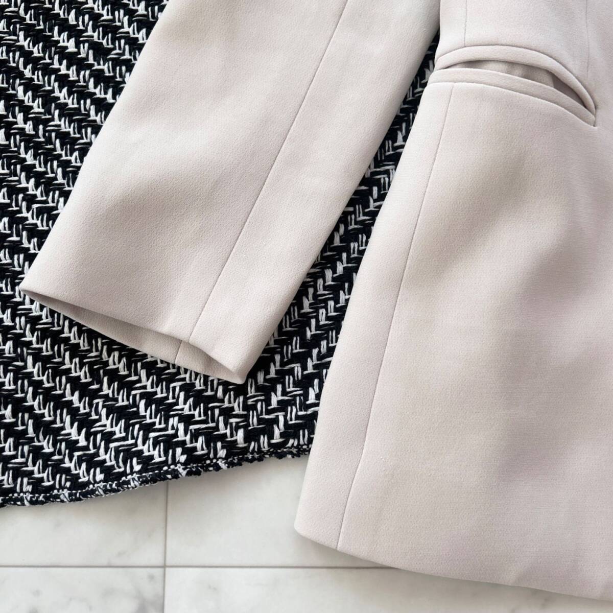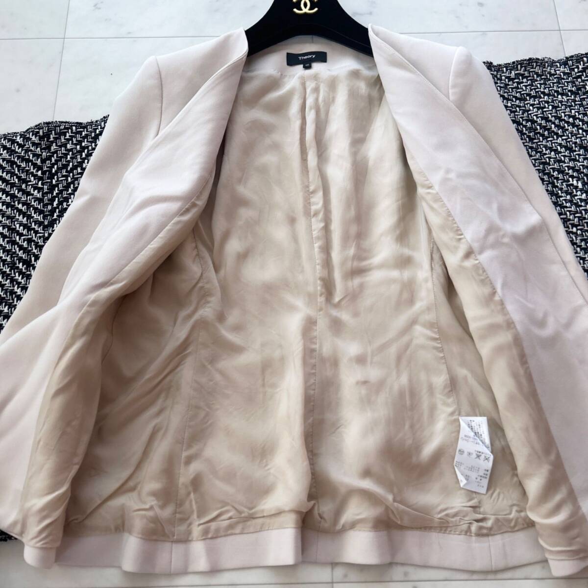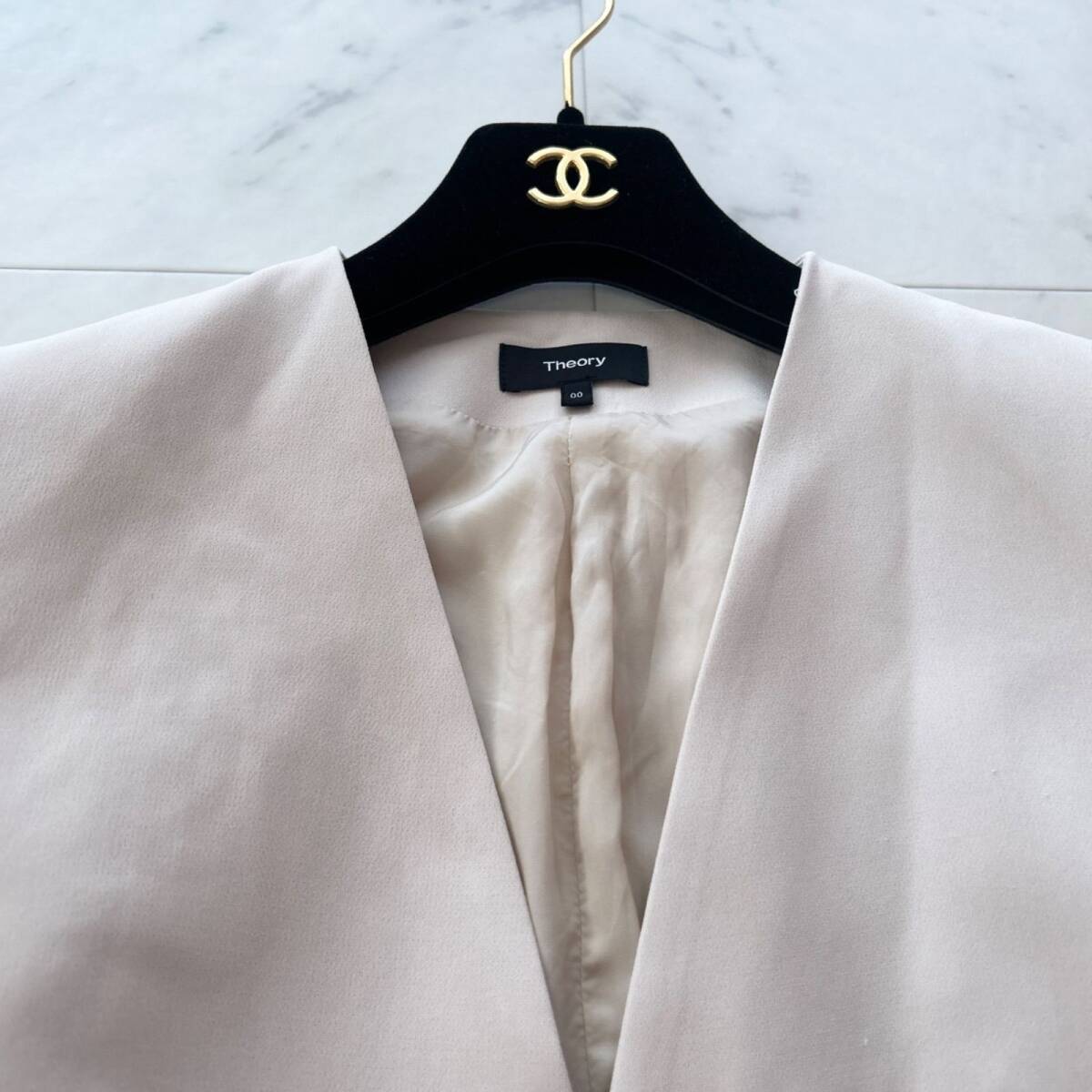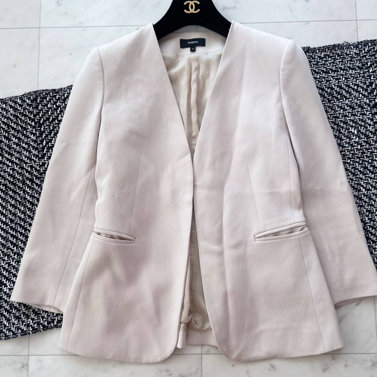 セオリーらしい洗練されたシルエットとシンプルなデザインが魅力のノーカラージャケットです。軽やかなベージュカラーは柔らかく上品な雰囲気を演出し、オフィスからフォーマルシーン、カジュアルなデイリーコーディネートまで幅広く活躍します。フロントにボタンをあえて付けないデザインがすっきりとした印象を与え、着るだけでスタイルアップして見えるのもポイントです。細身のパンツやスカートとも相性が良く、大人の女性にぴったりな一枚です。