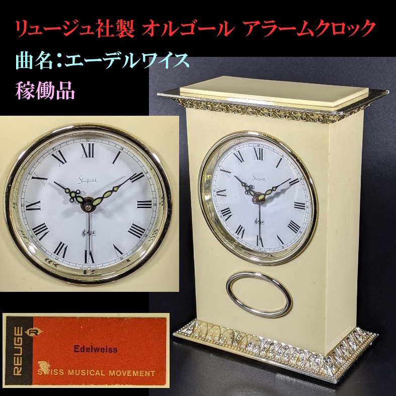 ◆動画有★稼働品◆超希少!機械式リュージュ社オルゴールアラームクロック/ゼンマイ式置時計目覚まし時計/エーデルワイス/REUGE/Sheffield