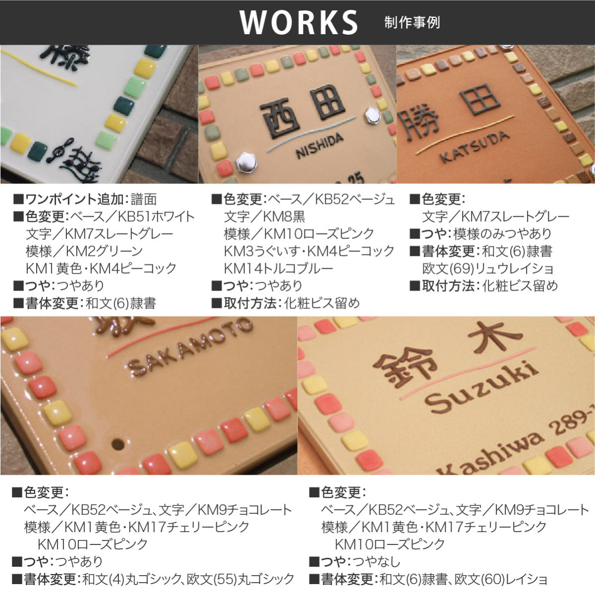 | 商品詳細 | 季節の彩りを取り入れたガーデニングシリーズ。カラーやサイズ、つやの有無など、お客様のお好み次第で変更出来ます。モザイク風のカラフルなタイル模様が人気表札です。縁起の良い浮き出し文字(凸文字)表札は全国でも珍しく、川田美術陶板ならではの技術です。 |