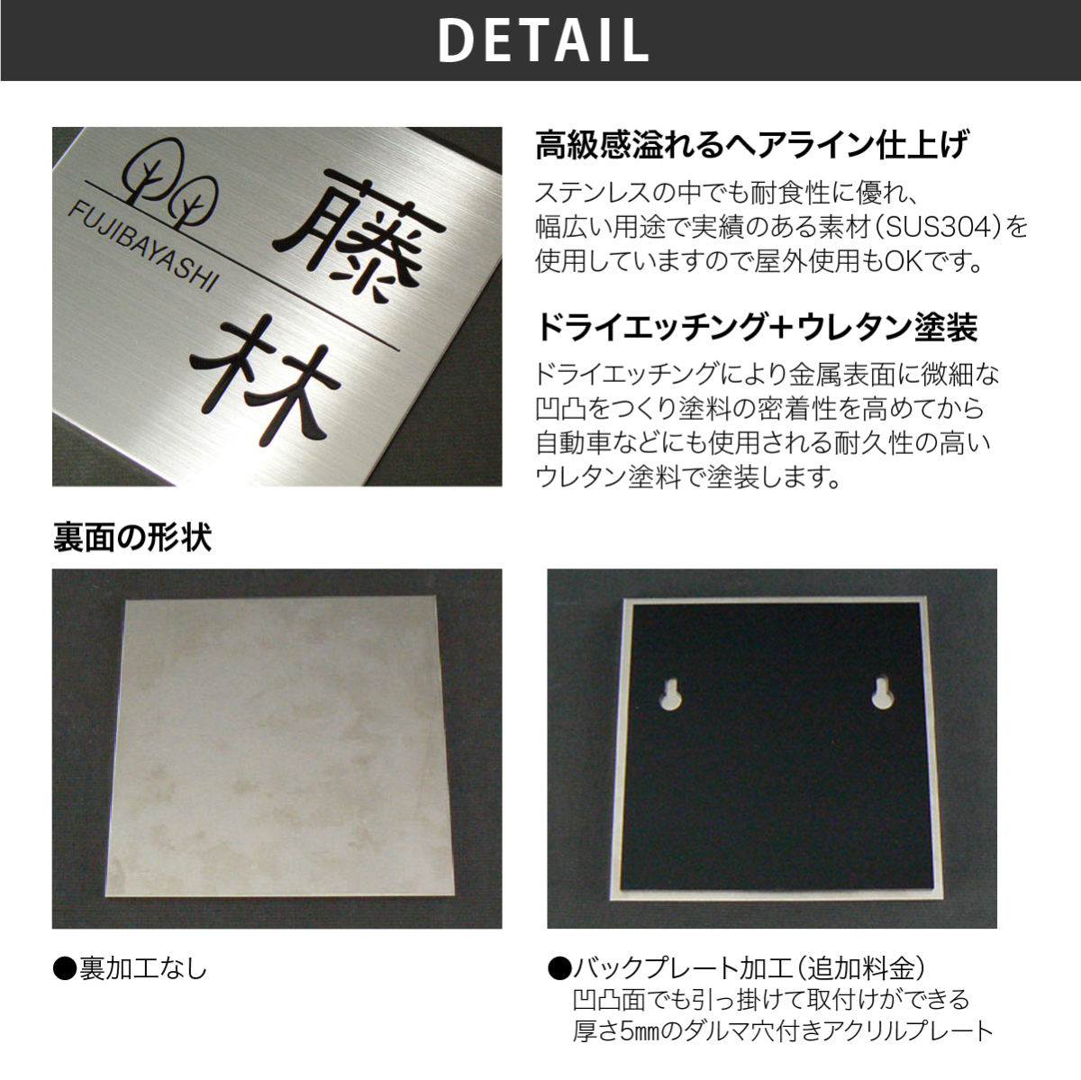 | 取付方法 | ●裏加工無しタイプ 接着剤(高性能コンクリート用)、または両面テープでのお取り付け。 ●バックプレートタイプ ネジとバックプレート、接着剤でのお取り付け。 |