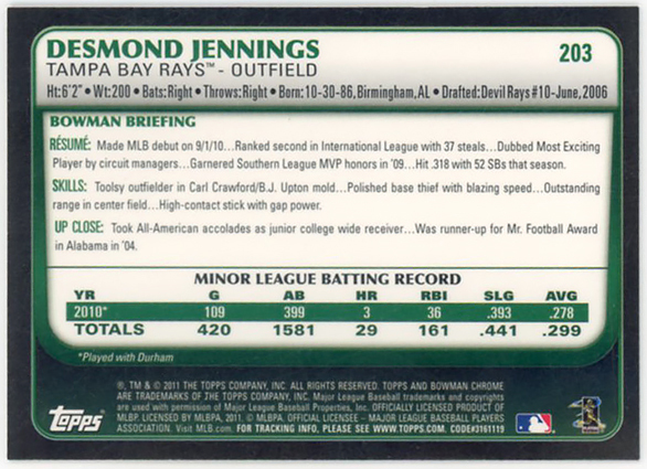 RAYS△DESMOND JENNINGS/2011 BOWMAN CHROME直書サインRC!