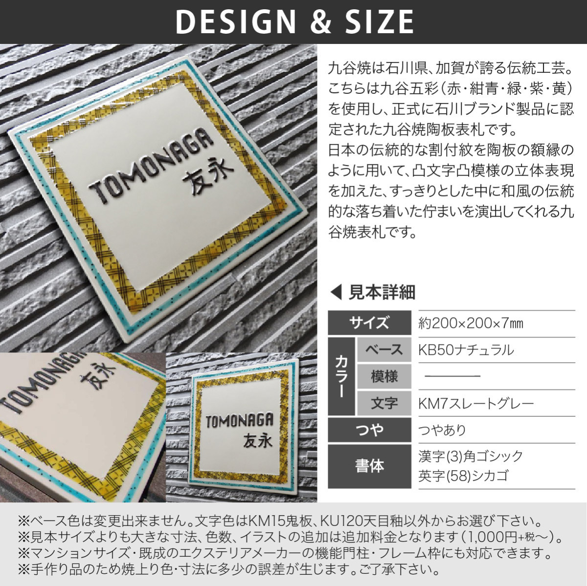商品詳細 | 九谷焼は石川県、加賀が誇る伝統工芸。こちらは九谷五彩(赤・紺青・緑・紫・黄)を使用し、正式に石川ブランド製品に認定された九谷焼陶板表札です。日本の伝統的な割付紋を陶板の額縁のように用いて、凸文字凸模様の立体表現を加えた、すっきりとした中に和風の伝統的な落ち着いた佇まいを演出してくれる九谷焼表札です。 |