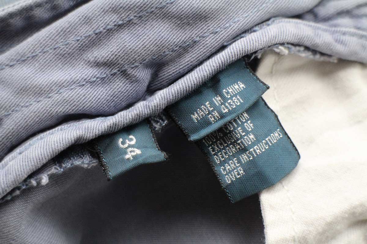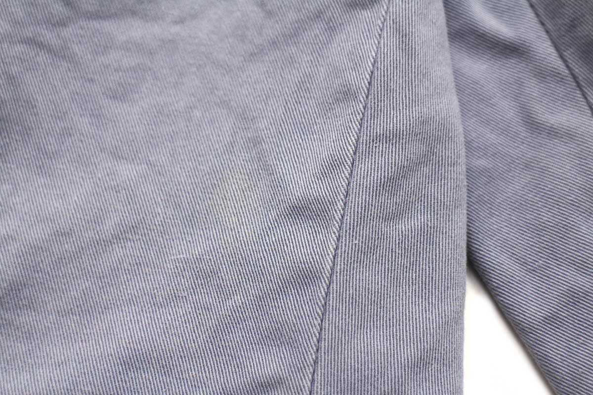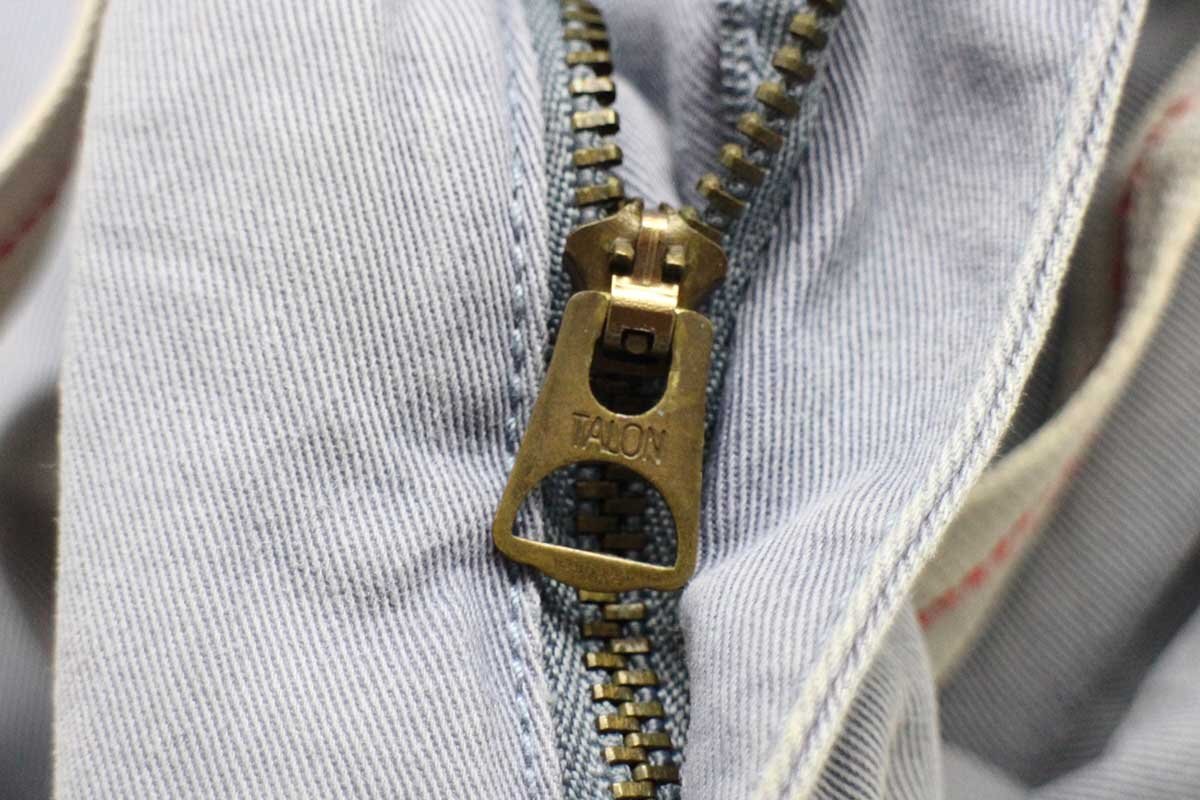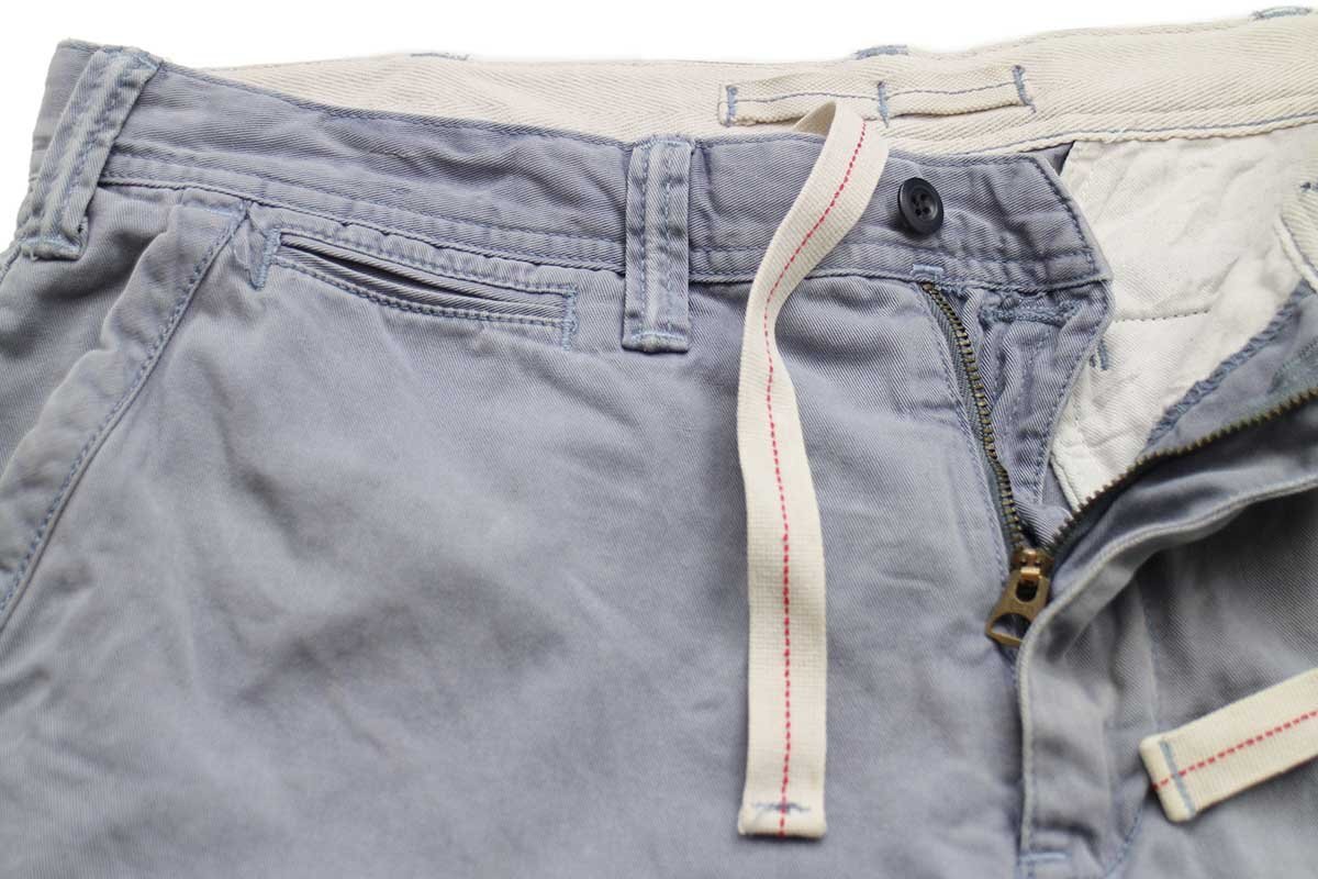 フロントジップフライ(TALON)、ウエストに紐あり、コインポケットあり、ヒップポケットは両玉縁、右ヒップポケット口に同色ロゴ刺繍入り、サイドシームはトリプルステッチ
