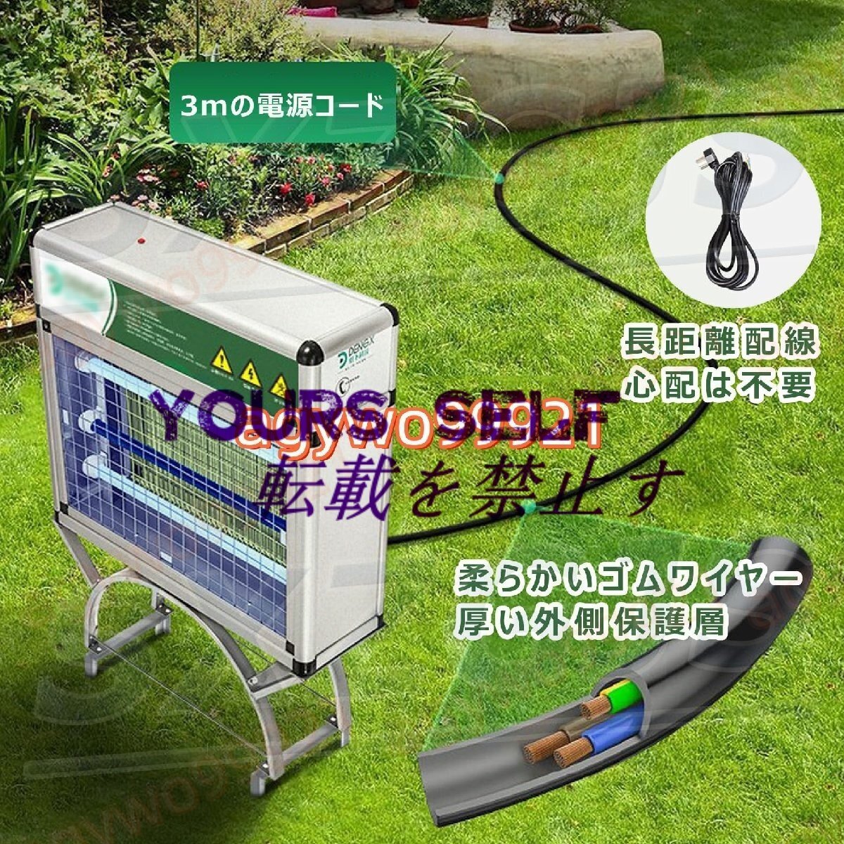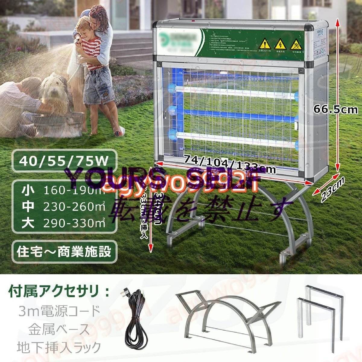屋外生活を快適に!次世代蚊取りライト屋外環境に最適化した屋外専用蚊取りライトです。住宅の庭、公園、農場など、あらゆる屋外シーンで蚊・ハエ・蛾を駆除し、快適な時間をお過ごしいただけます。【特許技術で安心・安全】スマート雨感知機能が自動で雨の日に電源をオフ、雨上がりに自動復帰。IPx4 防水性能で雨の影響を受けにくく、長期間の屋外設置にも耐久性を発揮します。【使い勝手の良い 2 モード運転】光感知モードでは周囲の明るさに応じて自動運転(暗くなると作動、明るくなると停止)。手動モードでは 24 時間連続運転も可能で、必要に応じて柔軟に使えます。【高効率で広範囲な駆除】蚊が好む ** 特定光波(UVA 波長)** で誘引し、第 3 世代高電圧デバイスが低ノイズかつ高出力で害虫を捕殺。最大 330㎡(75W モデル)までの広範囲をカバーし、商用施設から住宅まで対応可能です。【メンテナンスは簡単に】取り外し可能な保護ネットが清掃・部品交換をラクに。通電しない防護網で、お子様やペットの安全も考慮された設計。3m の長い電源コードで、電源までの距離を気にせず設置 OK。サイズ・パワー選択可能40W(160 - 190㎡)55W(230 - 260㎡)75W(290 - 330㎡)金属ベースと地下挿入ラック付属で、設置場所に合わせて使い分けできます。屋外でのアウトドアタイム、バーベキュー、園芸活動を、蚊や害虫のストレスから解放しませんか? 安心の品質と機能性で、あなたの快適な生活をサポートします。付属品:3m 電源コード、金属ベース、地下挿入ラック対応エリア:住宅・公共施設・農場等