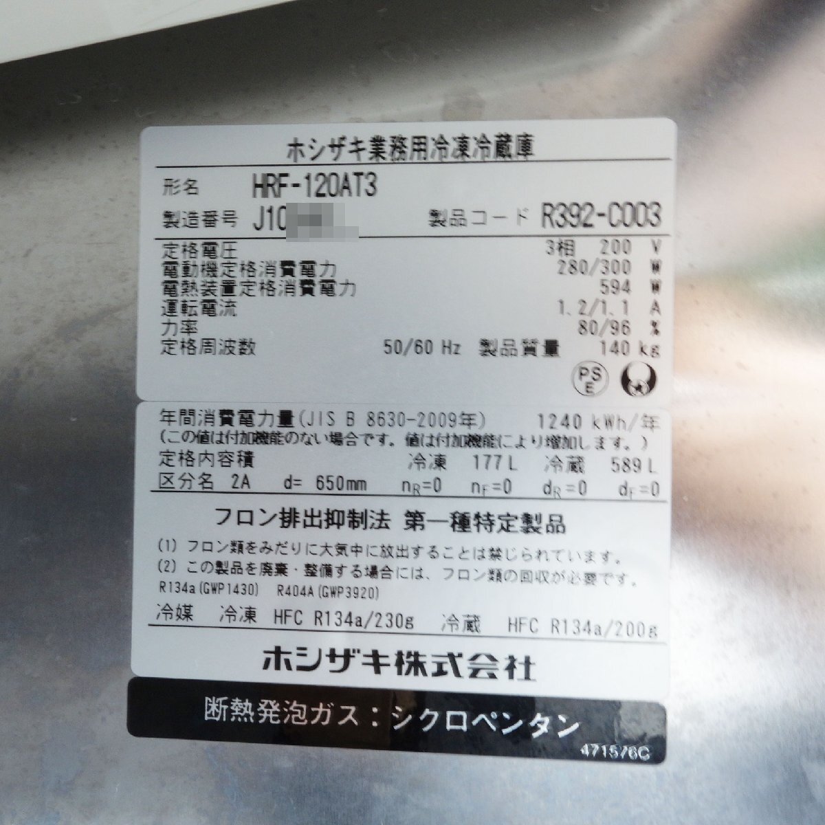 ホシザキ 4ドア 冷凍冷蔵庫 HRF-120AT3 ◆ 幅1200×奥行670×高さ1910mm 1室冷凍 三相200V 2019年製