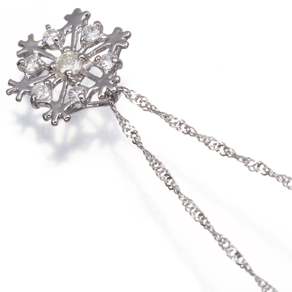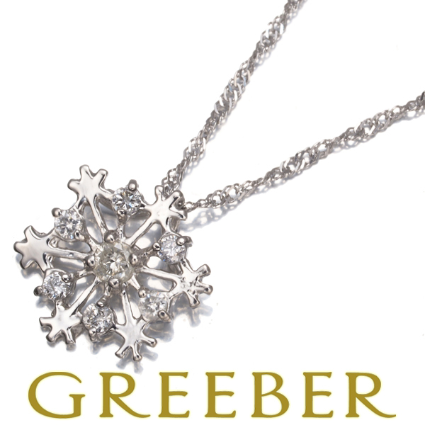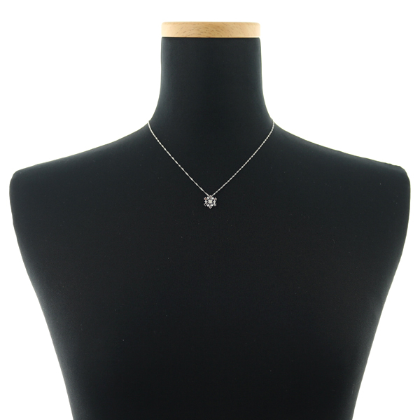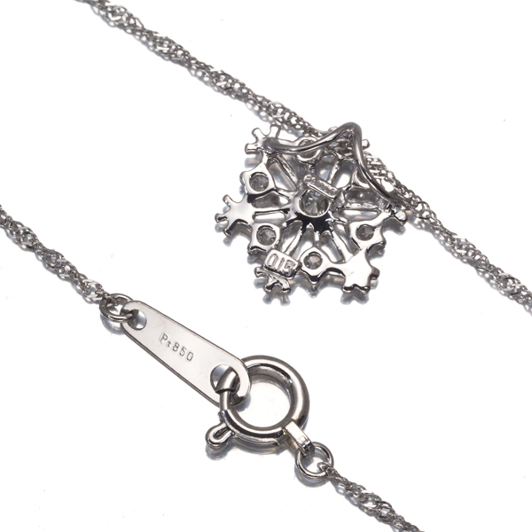 艶やかなプラチナの煌めきで演出したスノーフレークモチーフへキラリと輝くダイヤモンドを飾ったネックレスですよ。 |