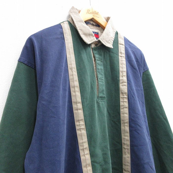 【商品名】 L★古着 トミーヒルフィガー 長袖 ブランド ラガー シャツ メンズ 90年代 90s ヒジ当て マルチカラー 緑他【spe】