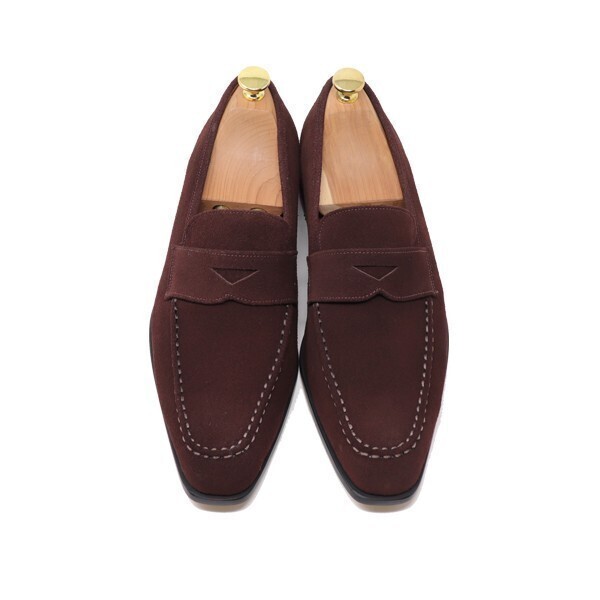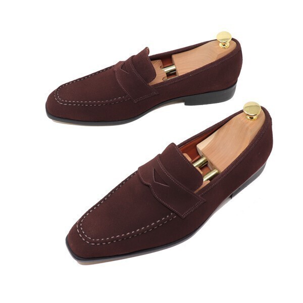 24.5cm メンズ 本革 スエード スクエアトゥ イタリアン ローファー スリッポン ハンドメイド 靴 ビジネス カジュアル ダークブラウン S5006