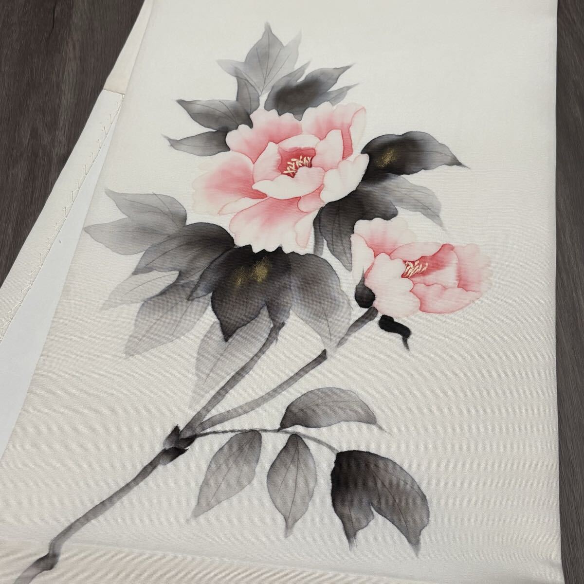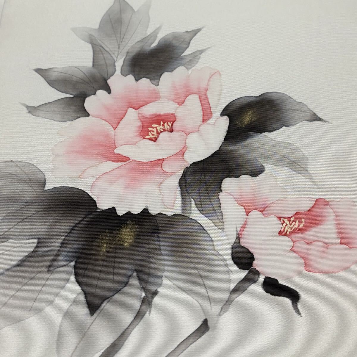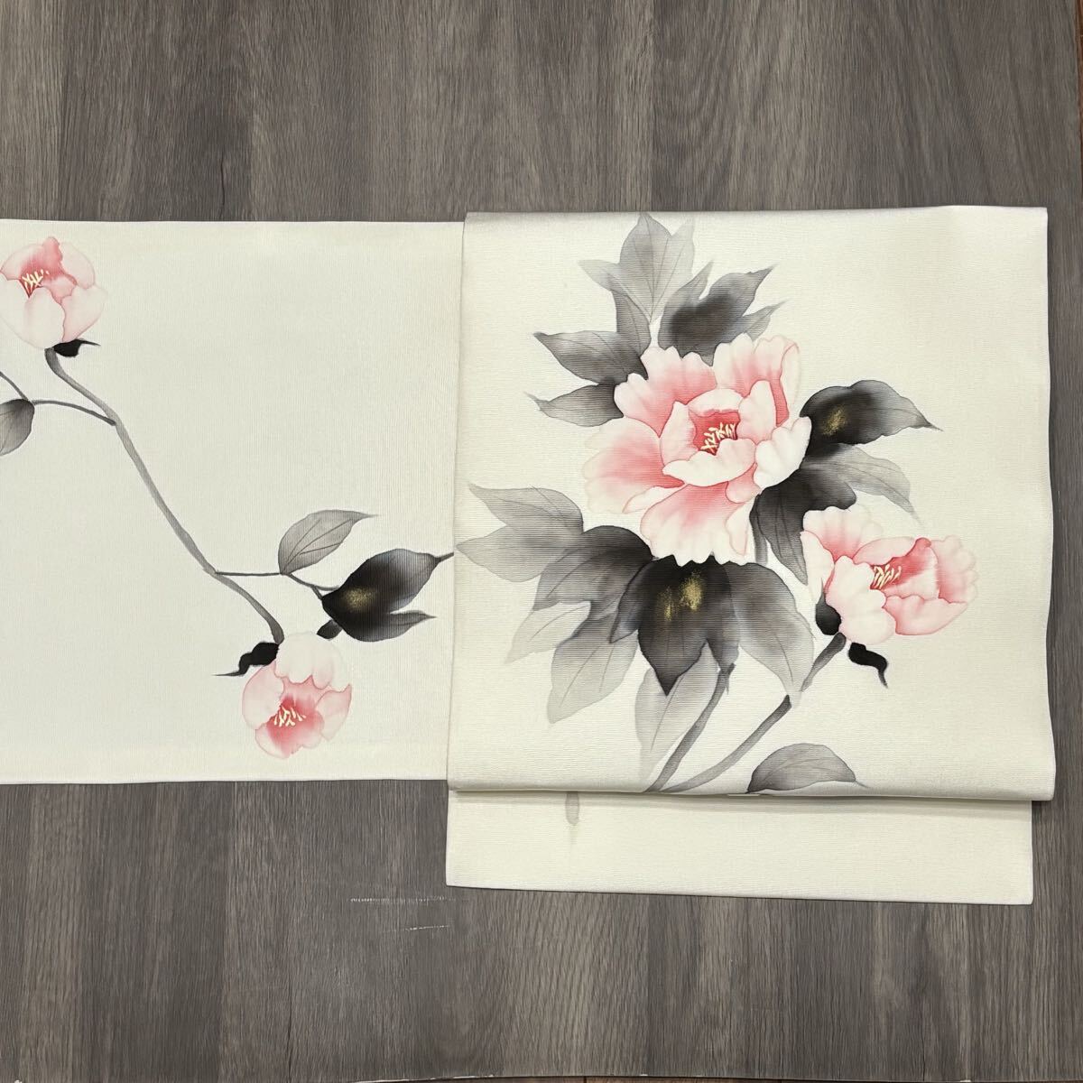 白地に優しい色合いで描かれた牡丹が映える塩瀬の名古屋帯。染めのクオリティの高さが魅力です。