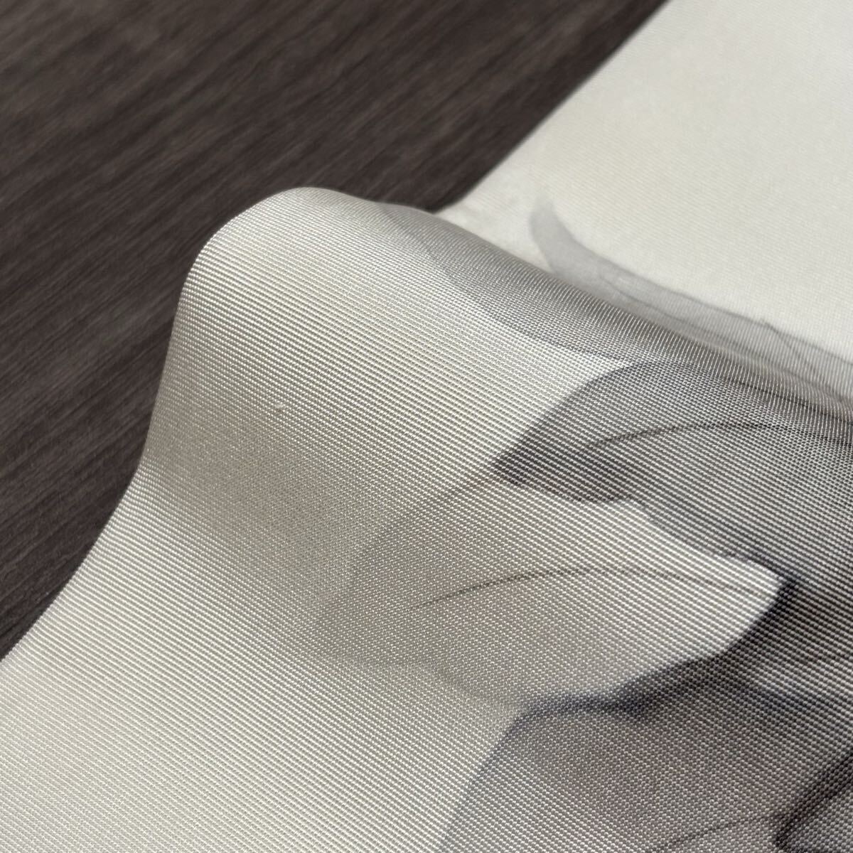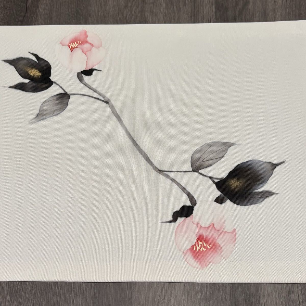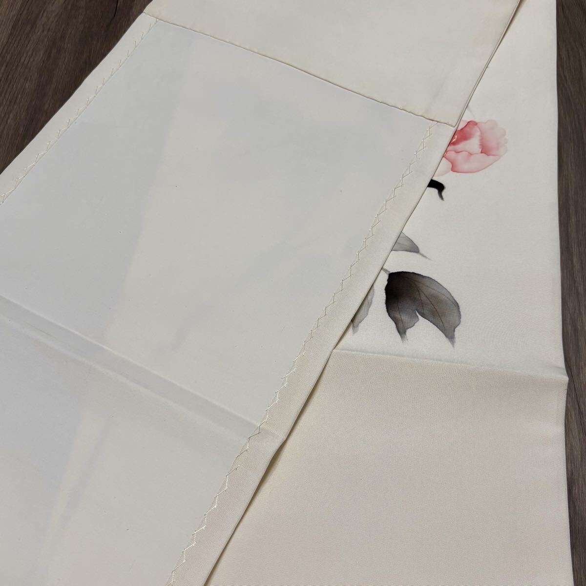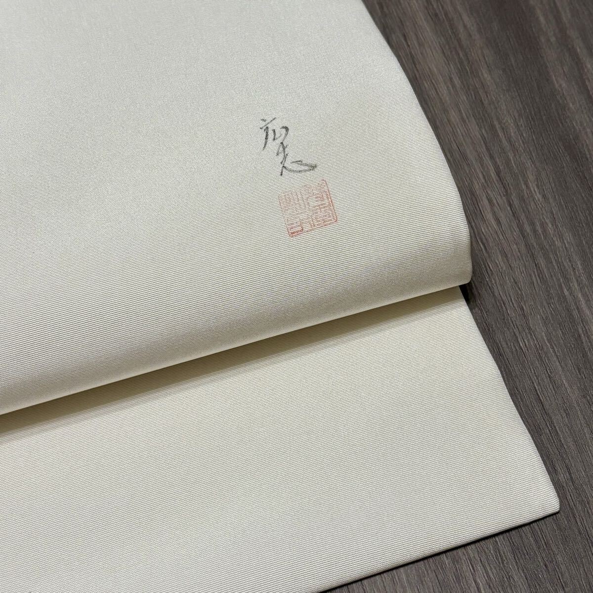 白地に優しい色合いで描かれた牡丹が映える塩瀬の名古屋帯。染めのクオリティの高さが魅力です。