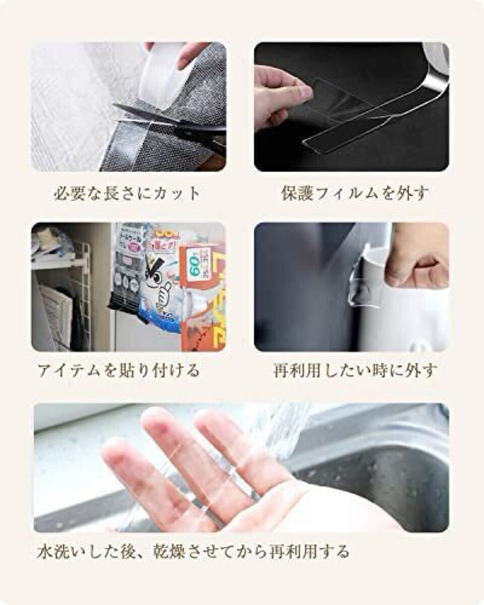 【水で繰り返し&多機能で活躍】更にこのテープは水で粘着性を回復できます!水で粉塵などを洗い落とし、テープを干してから、またもとのテープに戻れます。色んなシーンで大活躍します。濡れた状態の両面テープは粘着力が低下するのは魔法テープの共同特徴です。