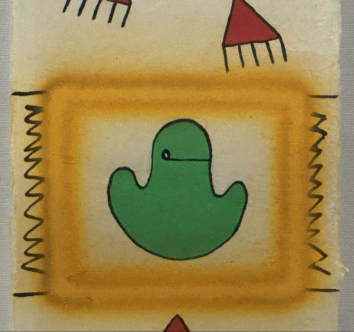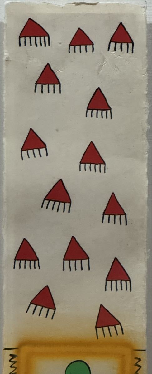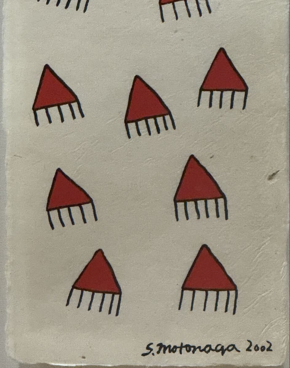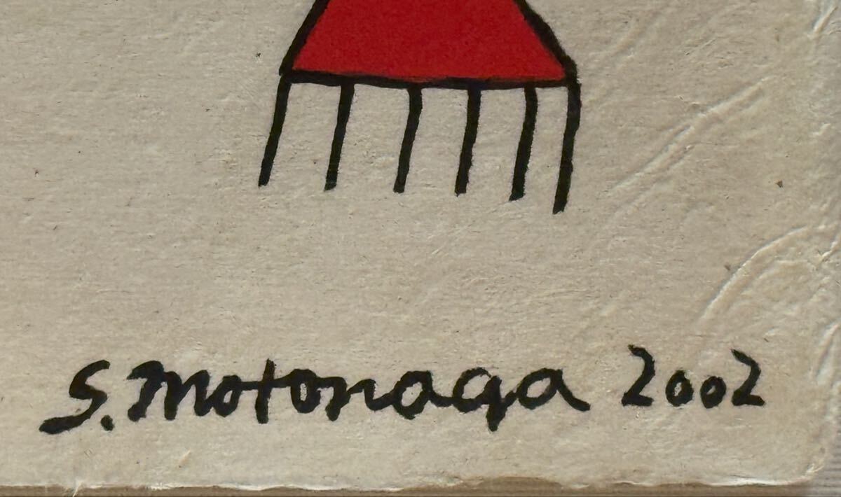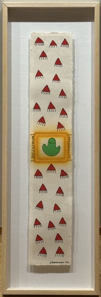2002年、気力・技術が充実した作者晩年期の希少な一作、和紙にアクリル抽象画「さんかくのまんなかにみどりのかたち」です。
