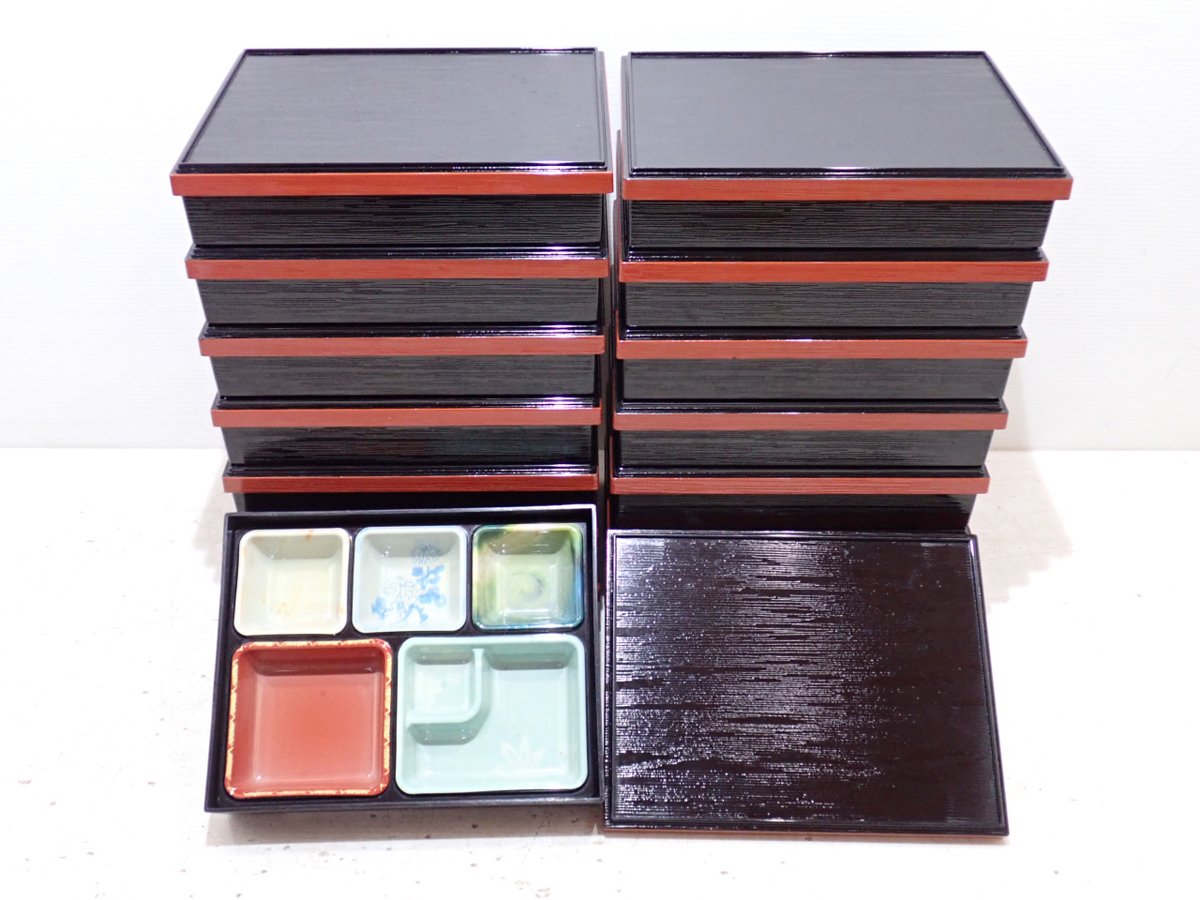 【Y0971】 業務用 若泉 和食器 黒渕朱内黒塗 長手 松花堂 弁当箱 光彩仕切 9-A 15点 セット/樹脂製 検:ヘギ目 仕出し 幕の内弁当 料亭 旅館 9寸