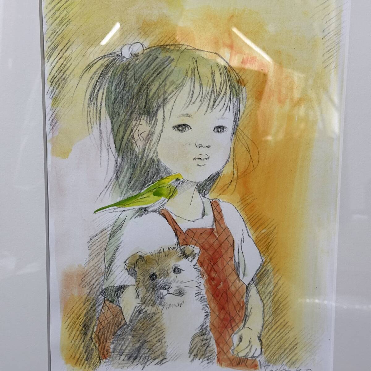 商品名: 【真作】 土井 紗知代「思い出(少女)」 リトグラフ 版画 手彩色 ED 78/100 額寸 53cm x 42cm 絵画 美術品 人物画 子犬