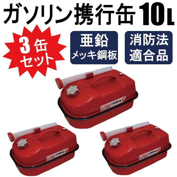 3缶セット ガソリン携行缶 10L 車載用に最適サイズ 消防法適合品 横型タイプ 亜鉛メッキ鋼板(防サビ) 【1個口】