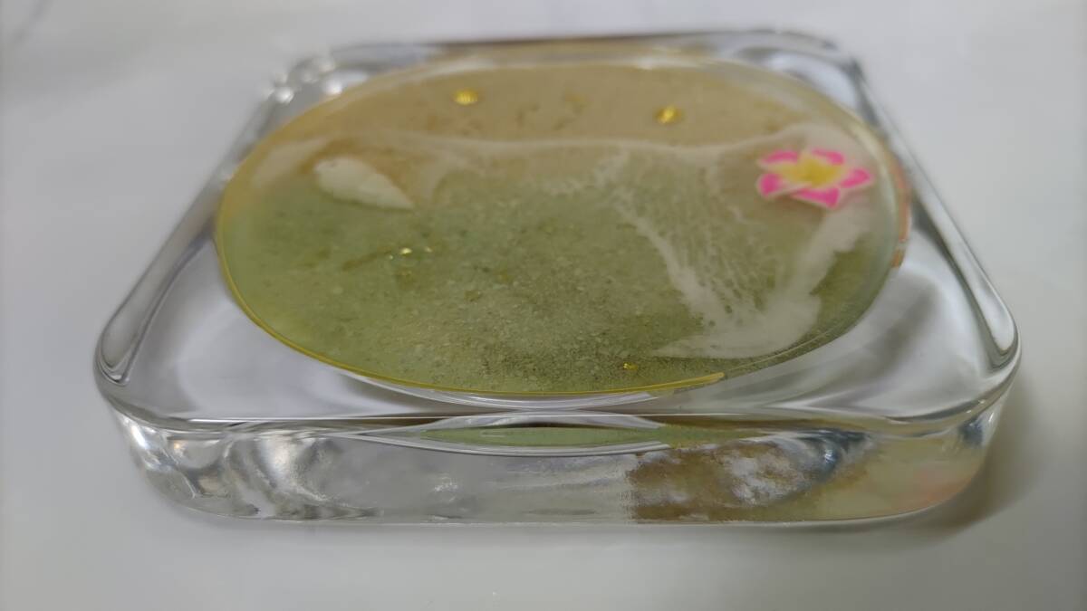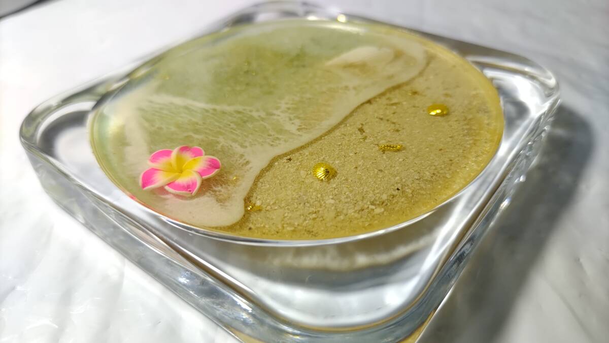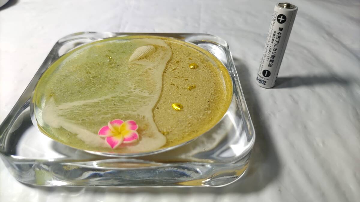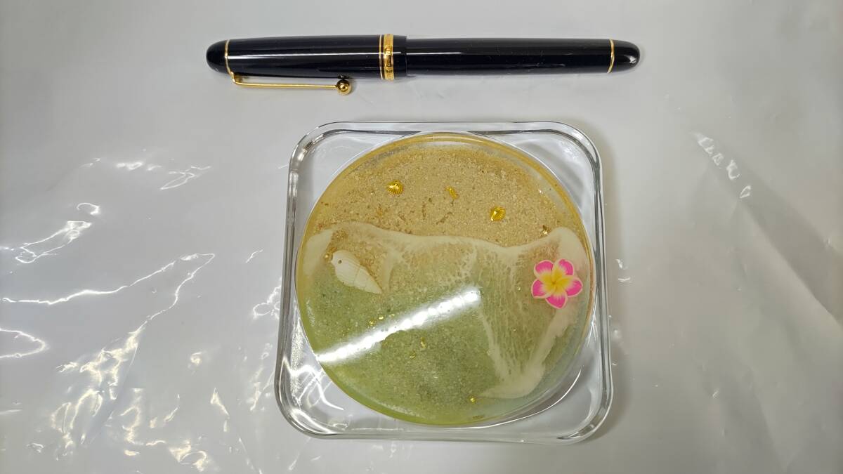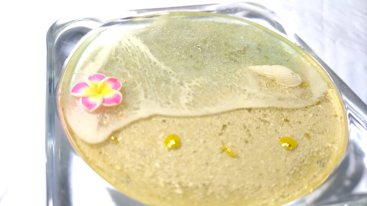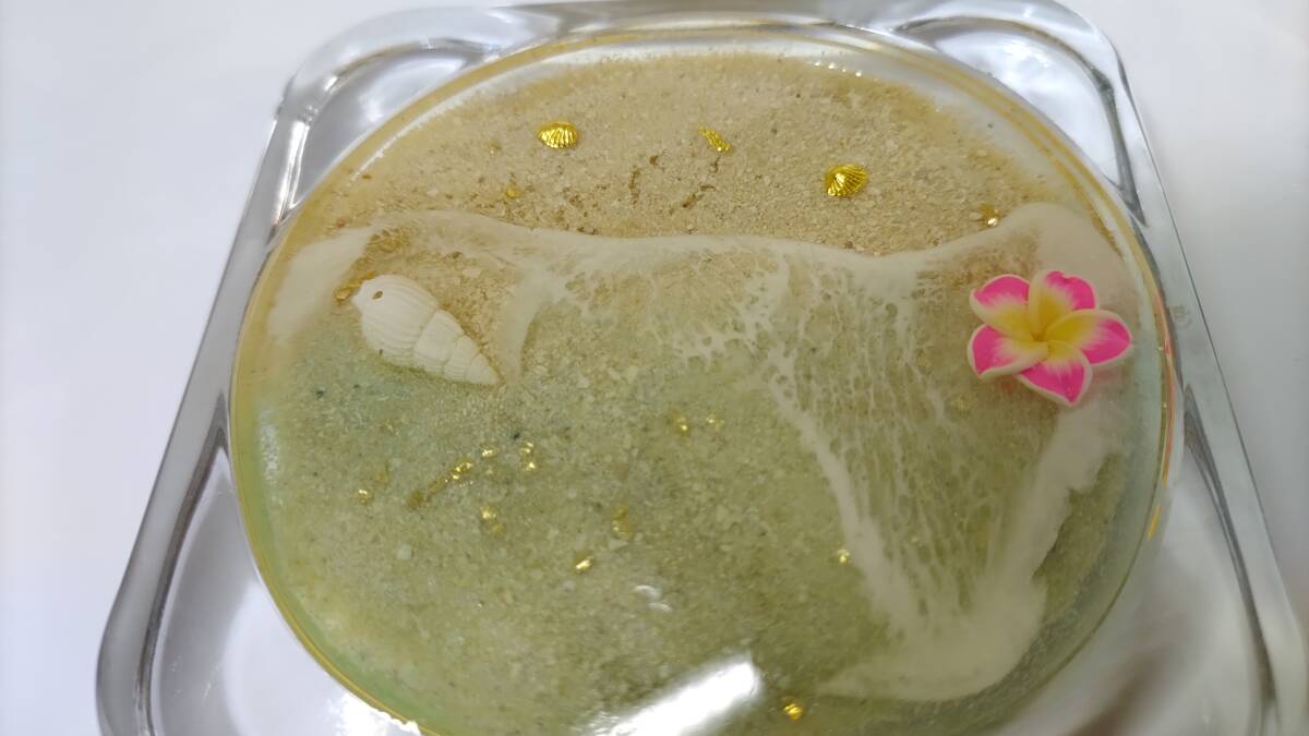 美しいビーチをイメージしたコースターです。透明のガラスのような素材の中にレジンの砂浜があります。新品未使用でとても綺麗な状態です。
