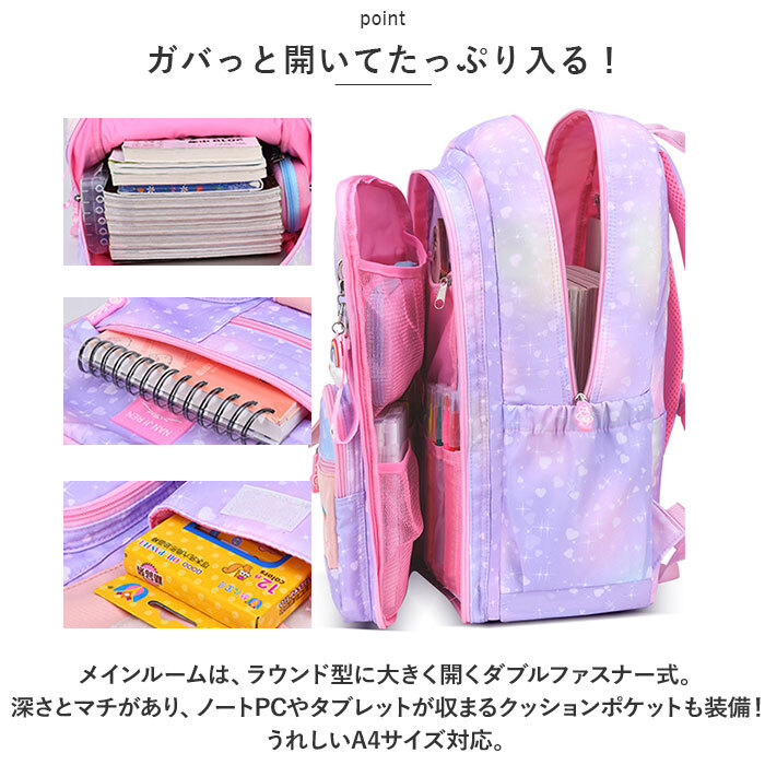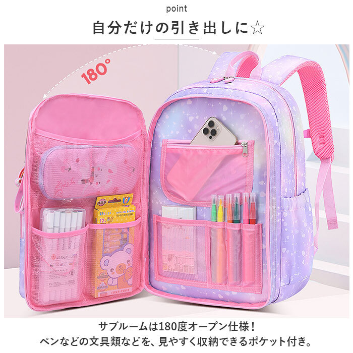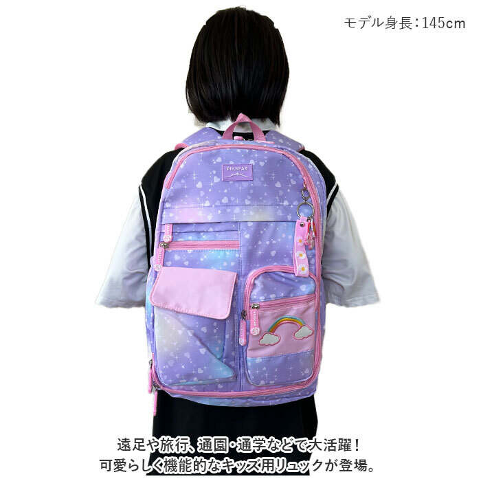 | 商品説明 | ・・遠足や旅行、通園・通学などで大活躍!可愛らしく機能的なキッズ用リュックが登場。 ・【収納力があり機能的なリュック】 ・お出かけに必要な荷物がすっきりひとまとめ!小物を整理整頓しやすい充実のポケット収納♪ ・【ガバっと開いてたっぷり入る!】 ・メインルームは、ラウンド型に大きく開くダブルファスナー式。深さとマチがあり、ノートPCやタブレットが収まるクッションポケットも装備!うれしいA4サイズ対応。 ・【自分だけの引き出しに☆】 ・サブルームは180度オープン仕様!ペンなどの文具類などを、見やすく収納できるポケット付き。 ・【サッと取り出せるポケット】 ・使用頻度の高い小物を入れておけるフロントポケット、ペットボトルや折りたたみ傘の収納に便利なサイドポケット、貴重品の収納に便利なシークレットポケットを配置。 ・【背負い心地快適】 ・背面とショルダーベルトは程よいクッション性があり、体にかかる負担を軽減。ショルダーベルトはムレにくいメッシュ素材。 ・【自分サイズにフィット】 ・体に合った長さにショルダーベルトを調節できるから、お子さまの成長に合わせてサポート!チェストベルトでズレ落ちを防止。 ・【キュートでポップなデザイン】 ・淡いグラデーションカラーにプリント柄をプラス☆刺繍デザインや、ロゴ入りのファスナー引き手もアクセントに。取り外し可能なチャーム付き!(※生産ロットや生産時期によってファスナーの引き手部分やロゴプレート、キーホルダーのデザインが異なります。) ・【ちょっとの雨なら大丈夫】 ・表面に汚れや水滴を弾くはっ水生地を使用。お手入れもサッと拭き取るだけ!(※完全防水ではありません。) ・【安心設計】 ・底面にもクッション材入りで、移動中に直置きしたときの衝撃をガード。ショルダーベルトには、暗闇でヘッドライトの光を反射するリフレクター付き。 |
