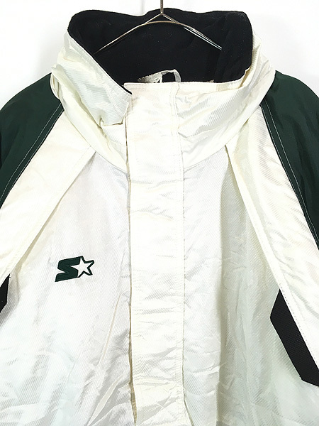防水効果が期待できるPUコーティングされたハリのあるナイロンシェル、左裾ジップ付き、首後ろ収納フード付き。