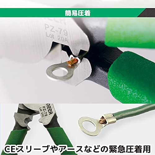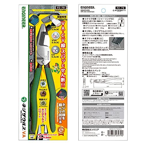 「ENGINEER エンジニア ネジザウルスVA 電気工事士試験対応 なめたネジ/潰れたネジ/錆びたネジ φ3~9.5mm用 PZー79」▼4989833039790▼(商品説明)Φ3~12mm用 [せん断刃搭載]・5. Φ3~9.5mm用[せん断刃仕様] Φ3~9.5mm PZ-79・・Style:Φ3~12mm用 [せん断刃搭載]・抜群の切れ味!VA線(φ2.6mm×3C)をラクラク切ることができます。・鋭利なシャーリング刃で電線だけでなく銅管(二分・三分)も軽く切断できます。・舐めネジ対応。ネジザウルス機能により錆ネジ、潰れネジを簡単に回せます。ドライバーがわりに使えますので、わざわざ専用のドライバーを取りに行く手間が要りません(ネジ頭:φ3~12mm)。・薄モノ把持。先端隙間ゼロにより、薄い結束バンドなども確実につかめます。従来のペンチのような空つかみ(スカ)がありません。・タテ溝をペンチの中心から3.5mmずらしたことで、細い結束バンド等も簡単に掴めます。・CEスリーブやアース用の緊急簡易圧着機能付き(適応範囲:1.25~3.5mm2)。説明 ネジ外し機能を搭載した、電設工事用の多機能ペンチ。 【特徴】 抜群の切れ味! VA線(φ2.6mm×3C)をラクラク切ることができます。 ・鋭利なシャーリング刃で電線だけでなく銅管(二分・三分)も軽く切断できます。 舐めネジ対応。ネジザウルス機能により錆ネジ、潰れネジを簡単に回せます。ドライバーがわりに使えますので、わざわざ専用のドライバーを取りに行く手間が要りません(ネジ頭:φ3~12mm)。 独自の先端形状により、頭の低いネジ(トラスネジ)にも対応。 薄モノ把持。先端隙間ゼロにより、薄い結束バンドなども確実につかめます。従来のペンチのような空つかみ(スカ)がありません。 網目状のクロスハッチにより通常のペンチに比べて保持力が向上しています。 タテ溝をペンチの中心から3.5mmずらしたことで、細い結束バンド等も簡単に掴めます。 CEスリーブやアース用の緊急簡易圧着機能付き(適応範囲:1.25~3.5mm2)。 ※本工具は非絶縁工具です。活線の切断や電源の入った機器には絶対に使用しないでください。 ※タッピングネジ、ドリリングネジ、コーススレッドなどの硬度が高いネジや、接着剤や錆で完全に固着したネジには使用しないでください。 ※鉄線などの切断には使用しないでください。 【用途】 電気工事、電気資材、土木、建築関係などでの作業に。 配管やダクトの止めネジの撤去。 潰れたネジ、錆びたネジの取り外しに。 【仕様】 対応ネジサイズ:φ3~12mm タテ溝硬度:HRC60±2 切断能力:VVF/2.6mm×3芯、VVR/5.5mm×3芯、CV/5.5mm×3芯、VCT/5.5mm×3芯、IV/22sq、CV/22sq(単芯) ※銅線のみ切断可。 圧着適応範囲:1.25~3.5mm2 全長:215mm グリップ幅:52mm 重量:340g 材質:本体/炭素鋼