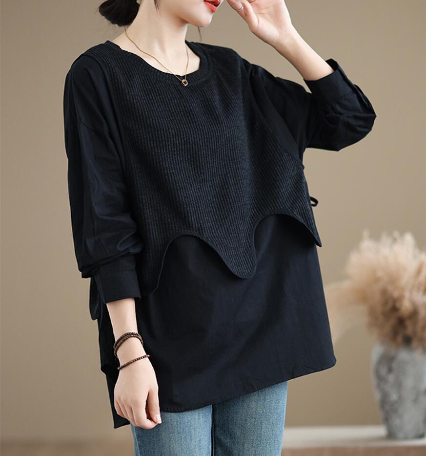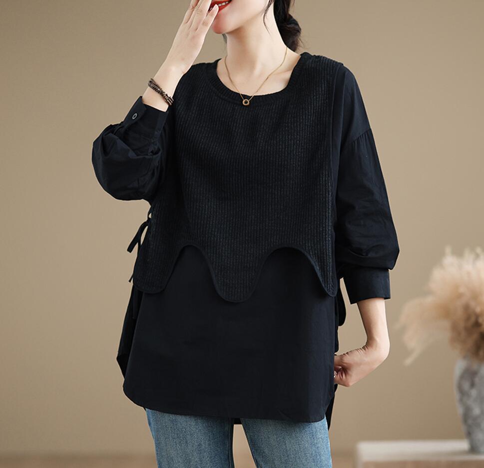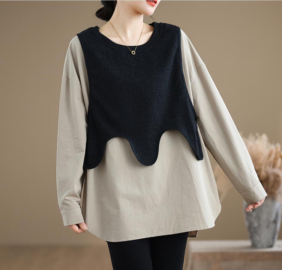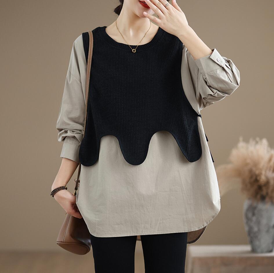 秋冬~レディース ニット 切り替え 長袖 重ね着風 ブラウス おしゃれ ゆったり 大きいサイズ トップス オフィス 通勤 チュニック~カーキ