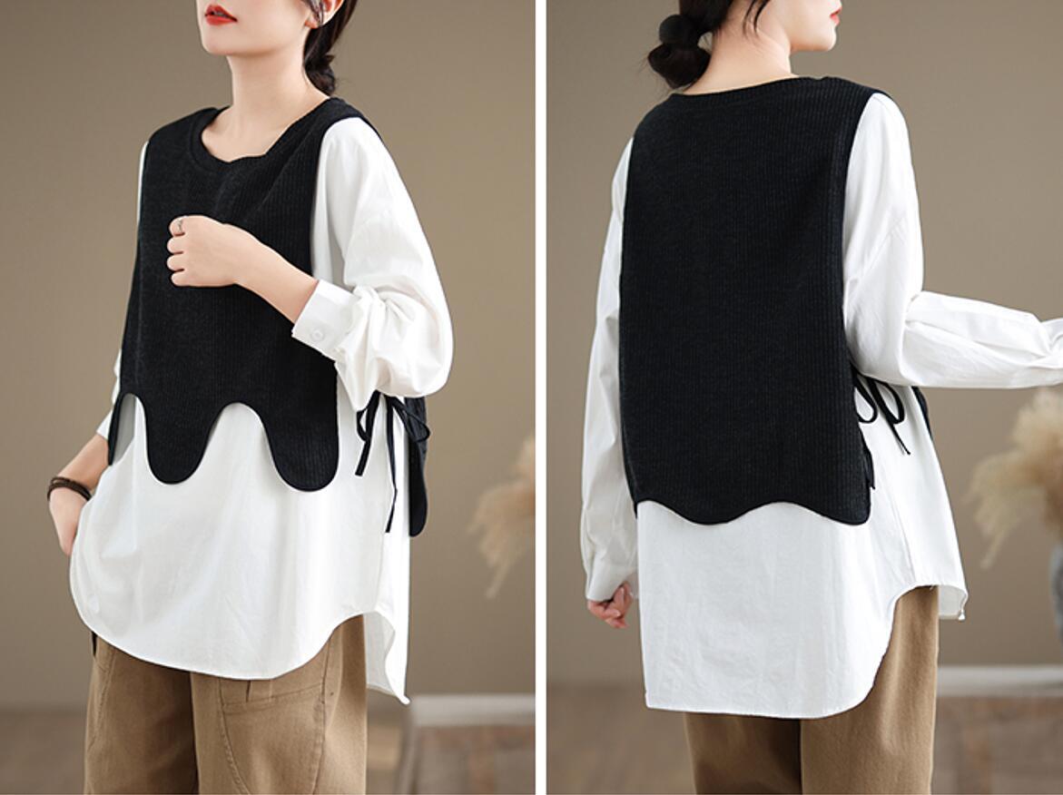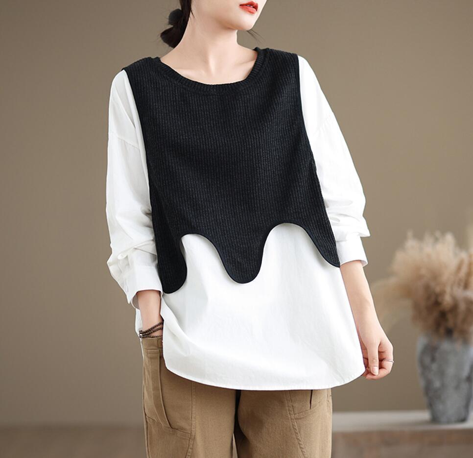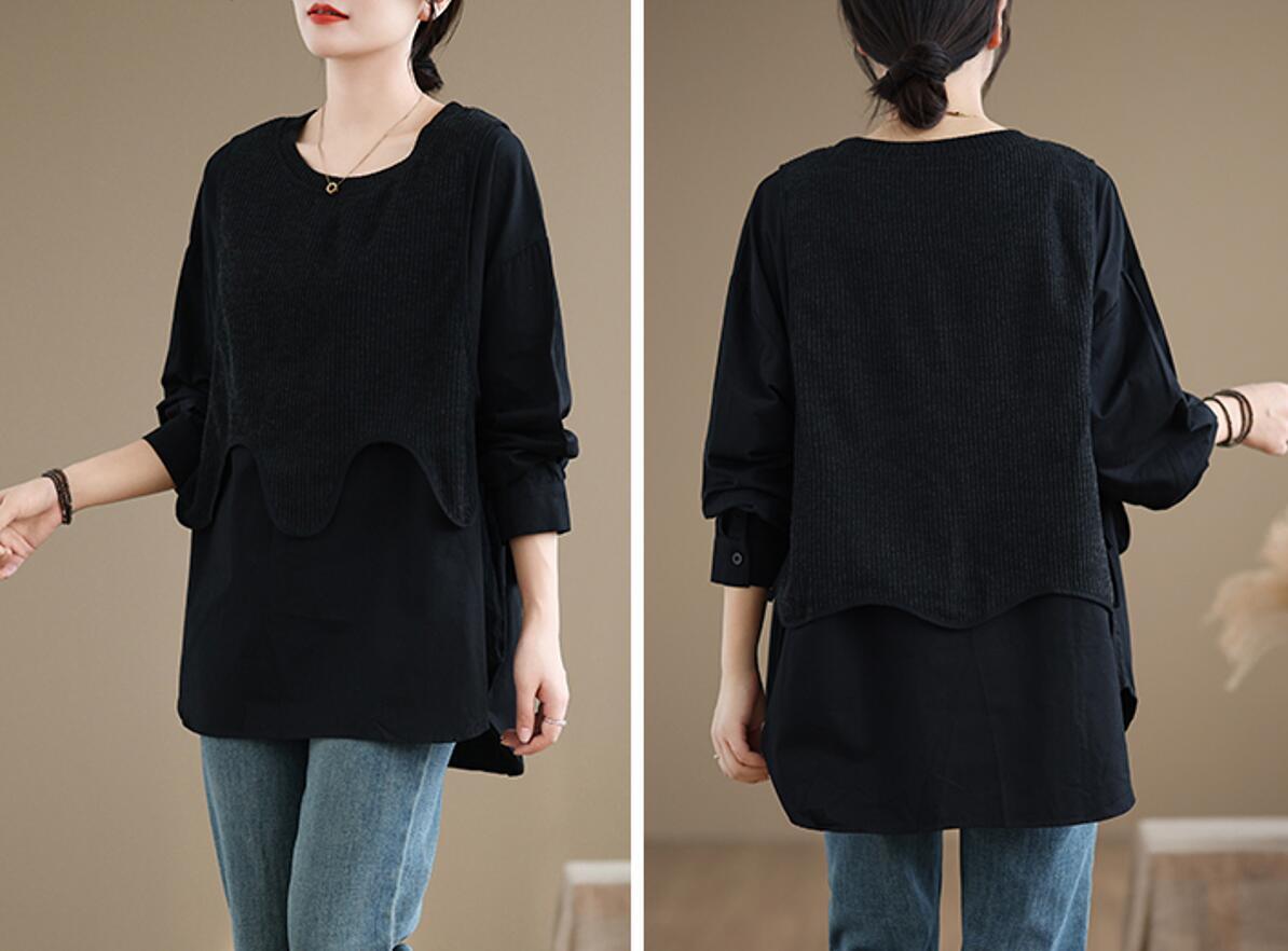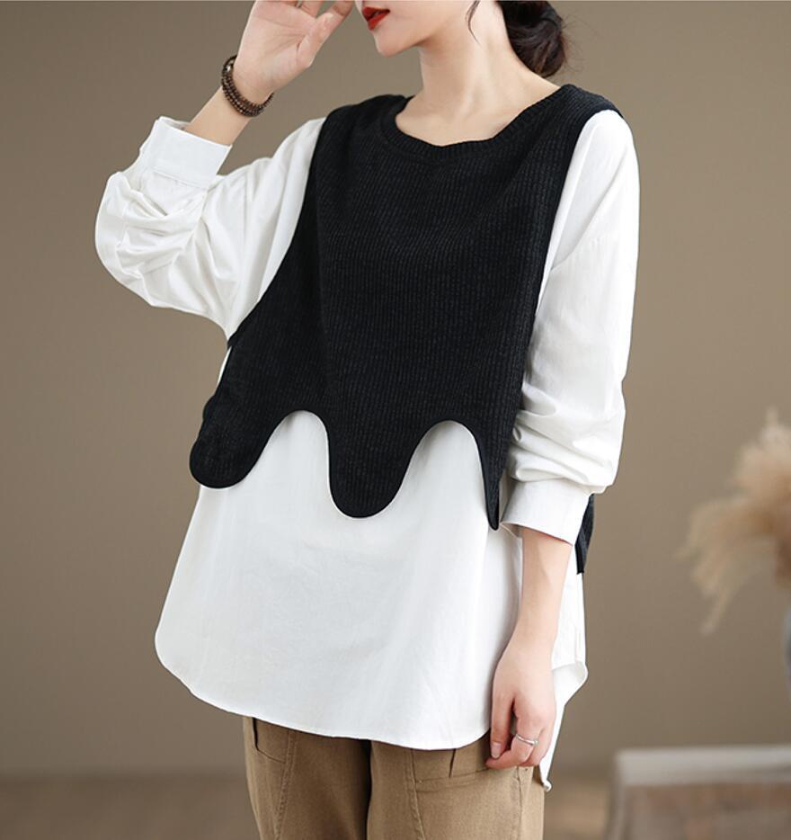 秋冬~レディース ニット 切り替え 長袖 重ね着風 ブラウス おしゃれ ゆったり 大きいサイズ トップス オフィス 通勤 チュニック~カーキ