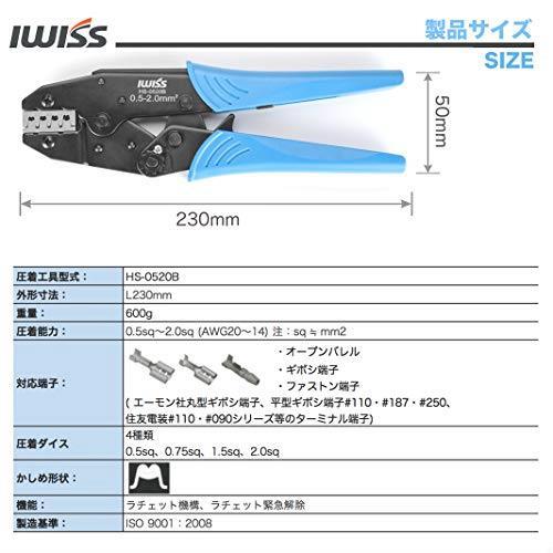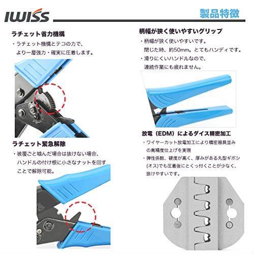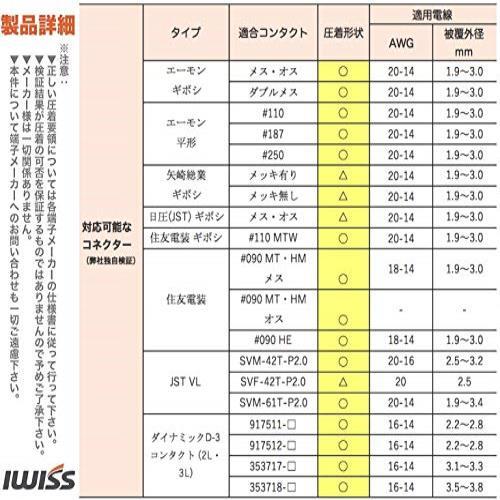 | ブランド:IWISS(アイウィス) ●感電の恐れがありますので、活線の圧着作業は行わないで下さい。 ●圧着する端子およびスリーブに適合する工具を使用して下さい。 ●適正な接続を得る為、圧着する端子およびスリーブと電線のサイズを間違えないようにして下さい。圧着不良により火災の原因となる恐れがあります。 ●成形確認機構により、完全に圧着できるまでハンドルは開かない。 全長:230mm; 重量:600g 圧着能力:0.5-2.0mm*注:mm≒sq 用途: エーモン社丸型ギボシ端子、平型ギボシ端子#250・#187、ダイナミックコネクタD-3000シリーズD-3コンタクト2L・3Lに対応 圧着ダイス(4サイズ):0.5sq、0.75sq、1.25sq、2.0sq 特徴:①芯線と被覆同時圧着、②EDM加工によりダイスの弾性係数が高く、厚みある丸型ギボシ(オス)でも圧着後に抜けやすい、③ラチェット機構・ラチェット緊急解除 | |||