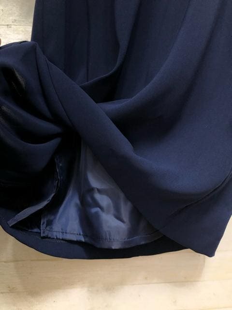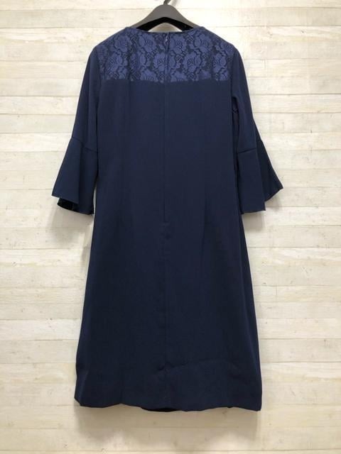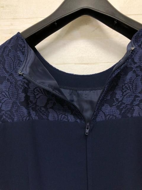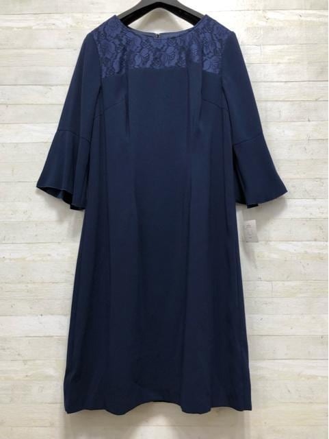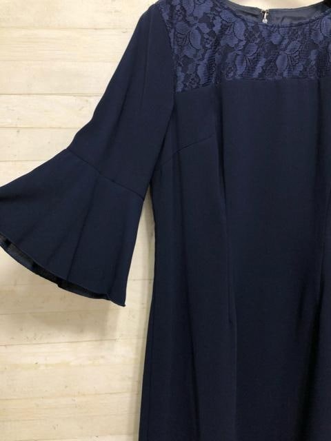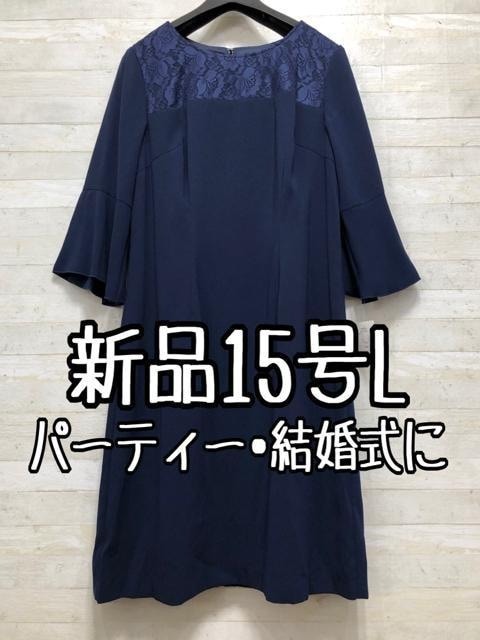 新品☆15号L紺系♪レース切替&フレア袖きれいワンピース〇p935