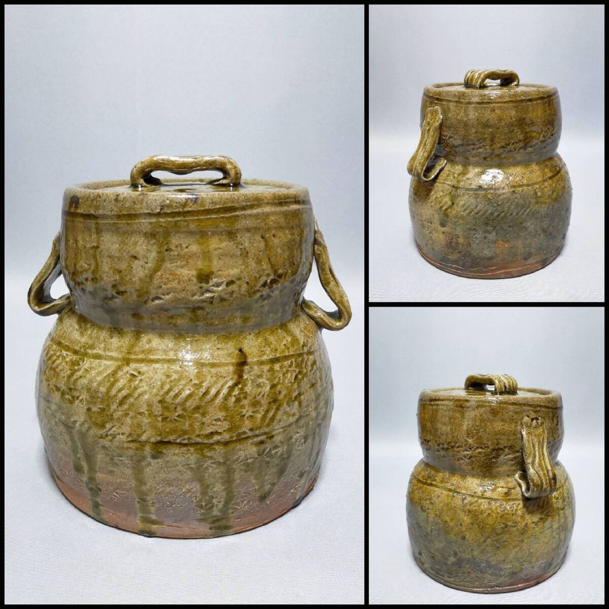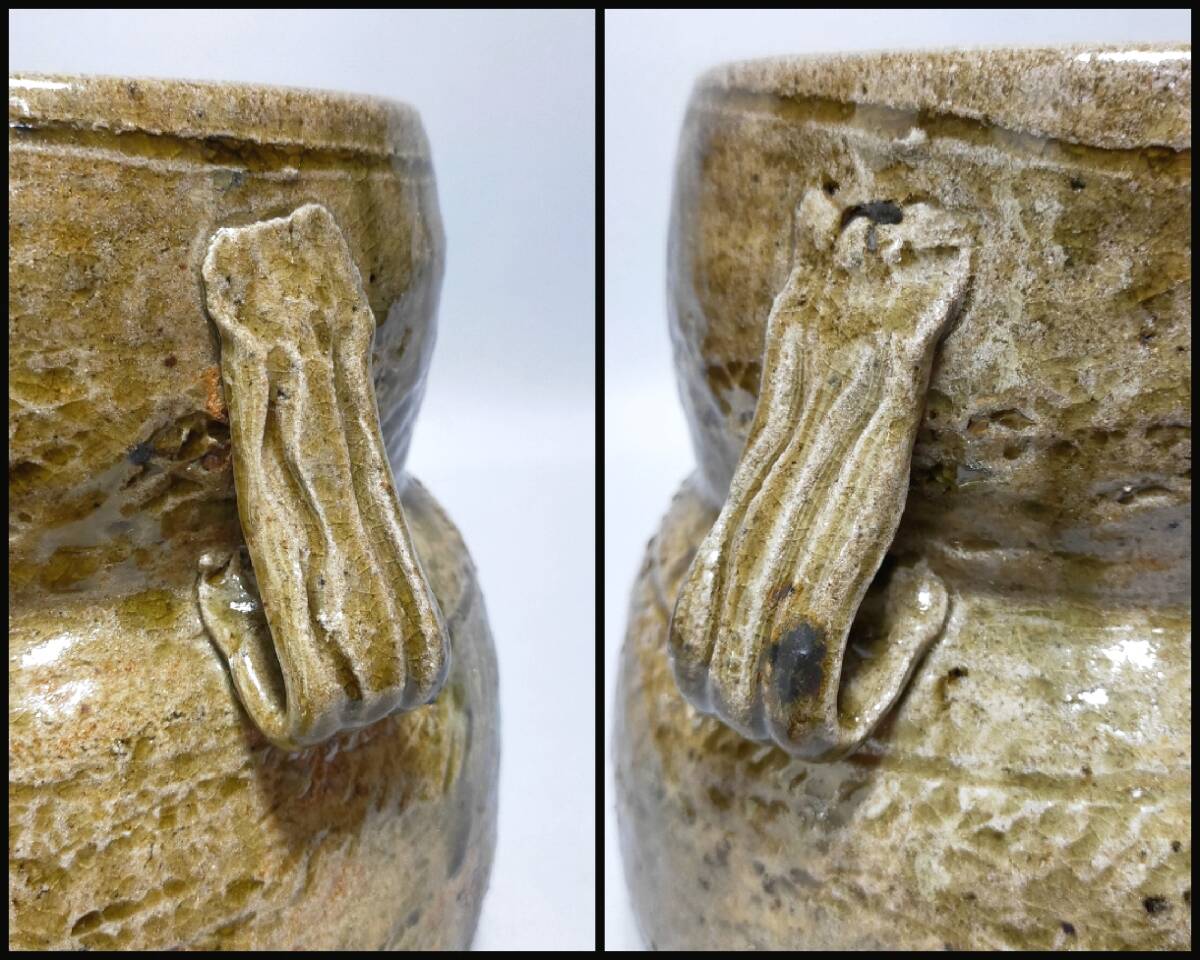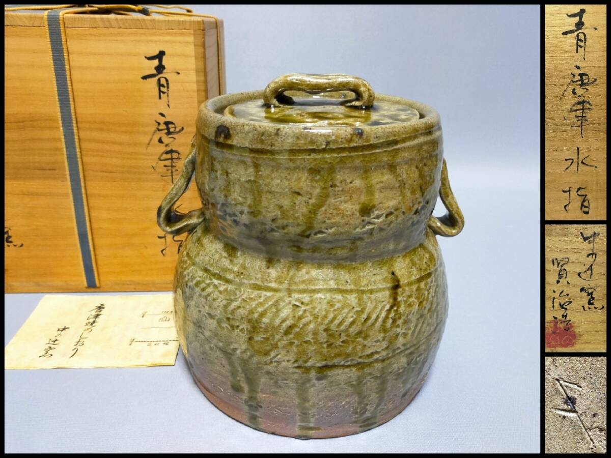 FK25 唐津焼 水指 中の辻窯 平山賢治 造 青唐津 耳付水指 高20.5cm 栞・共箱 茶道具