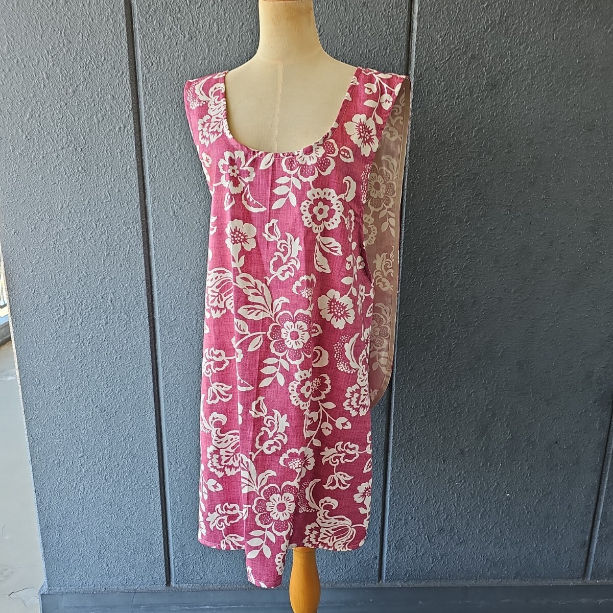 サイズは、着丈(肩紐込)94㎝、幅は布地幅140~150㎝の布を使用しています。