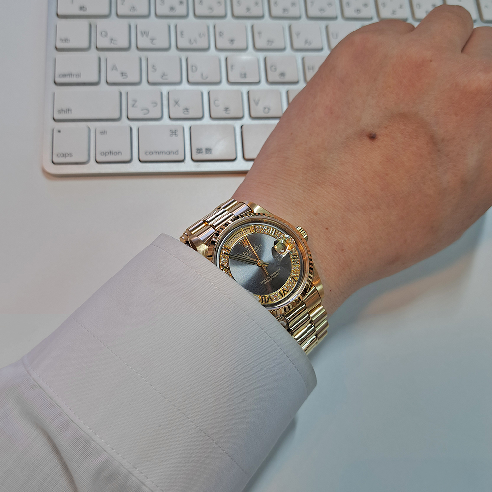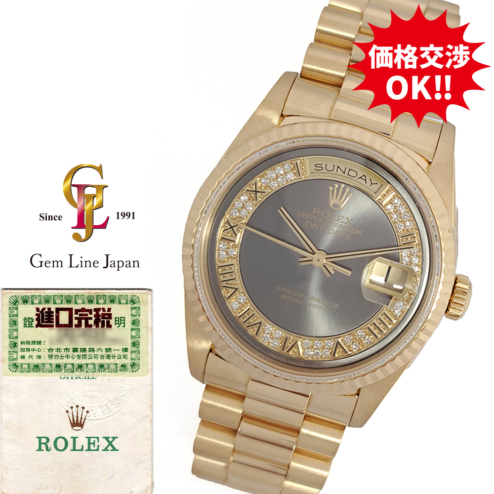 | 商品名 | ロレックス デイデイト 18238MR S番 ミリヤードダイヤ グレー ローマン 金無垢 美品 ギャラ付 メンズ 自動巻 時計 | ||