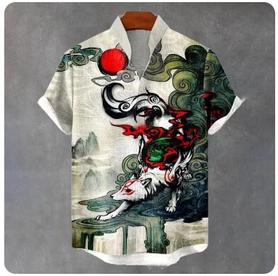 男女兼用半袖ボタン付きカジュアルシャツ、デザイン:白狼
