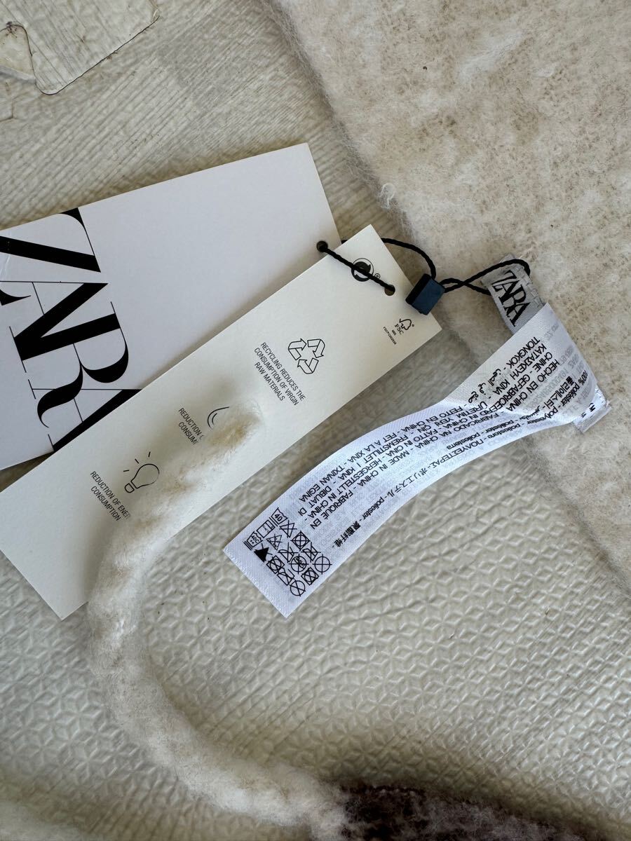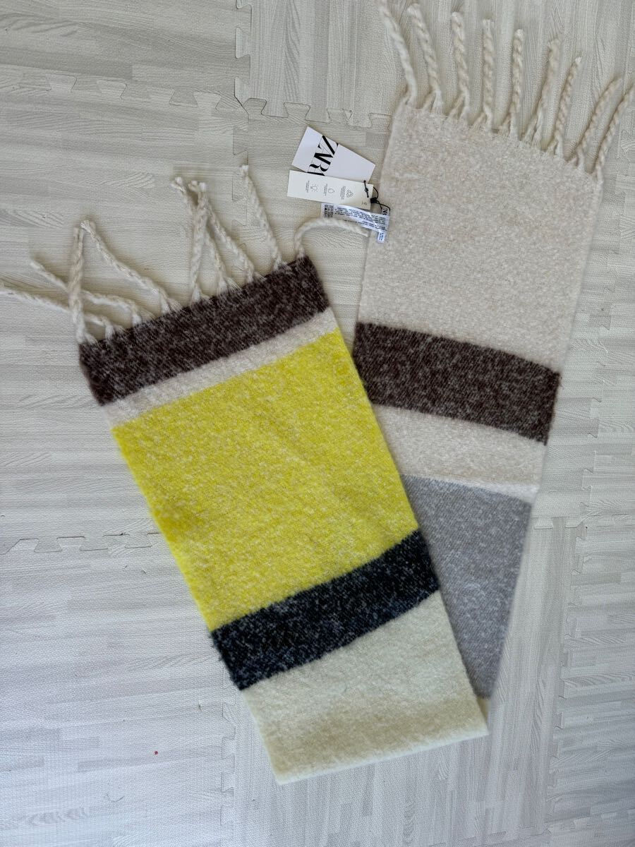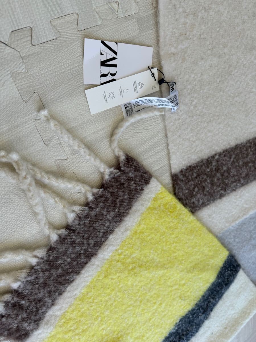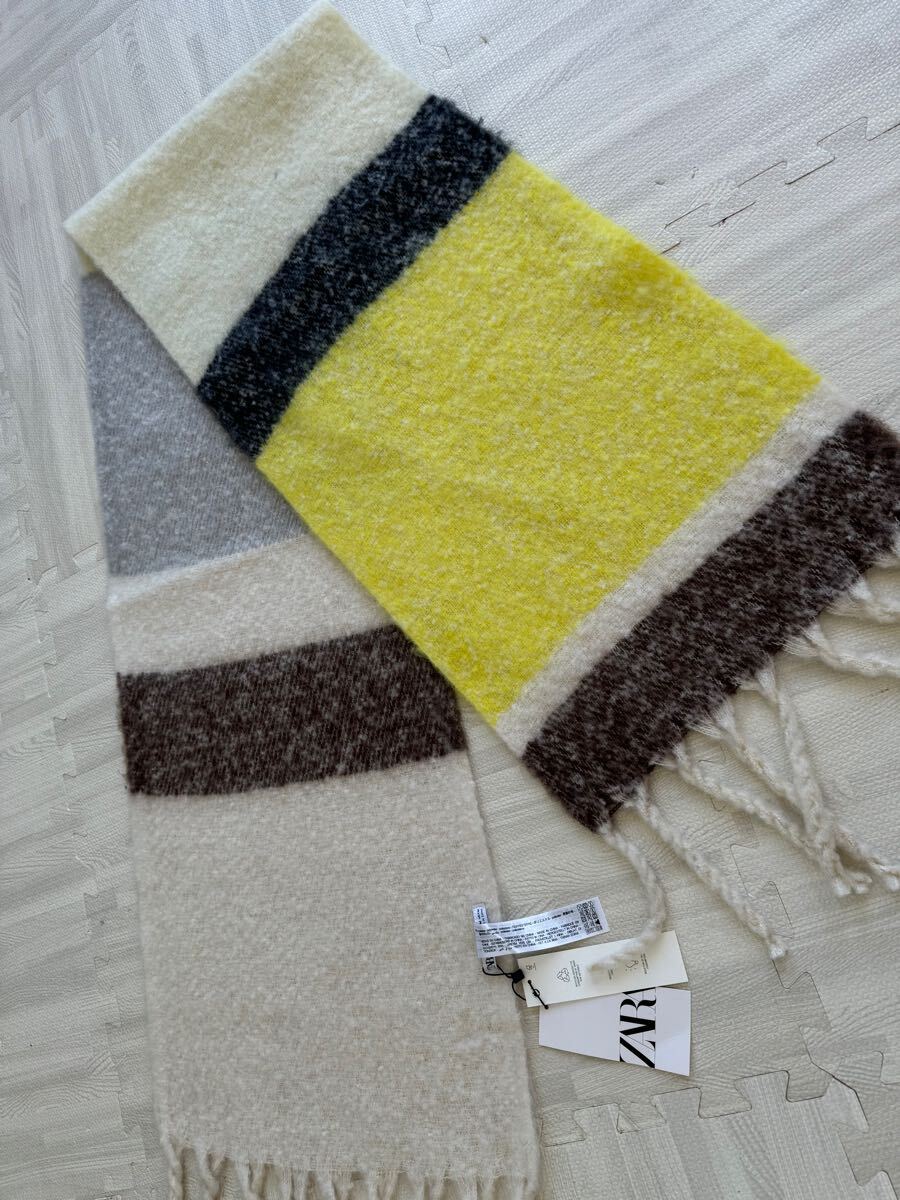 ZARAの大判モヘアストールになります。色が黄色オフホワイト茶グレーで成り立っており、非常に鮮やかな雰囲気です。私はロエベのモヘアストールを持っているのですが、非常に気時間も似ており使いやすいアイテムになっております。