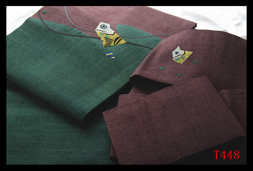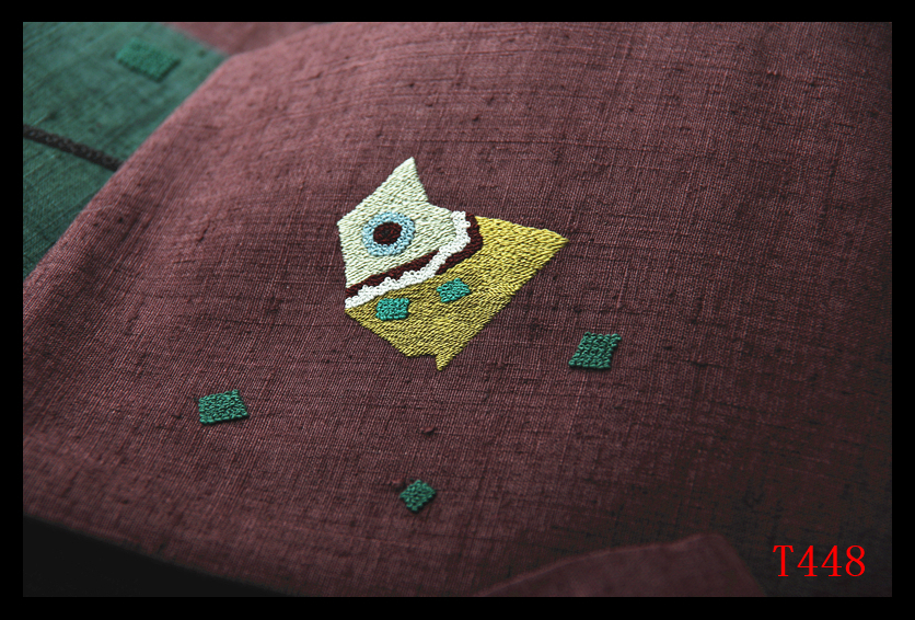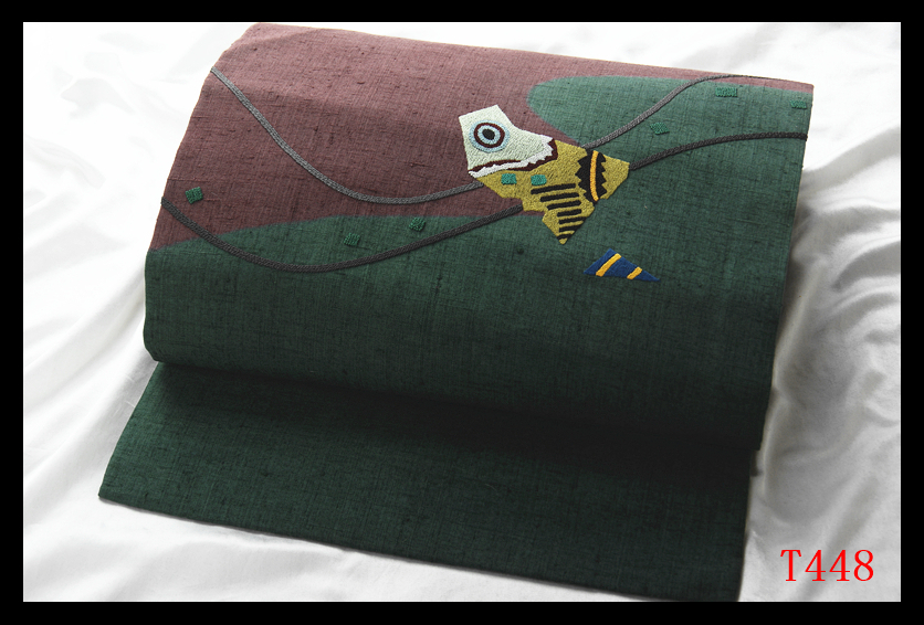 蔵【T448】厳選逸品 紬 相良刺繍 千歳緑色暗紅色 気品豊かに 正絹高級美術名古屋帯 ◇検◇簪着物袋帯和装小物帯締め